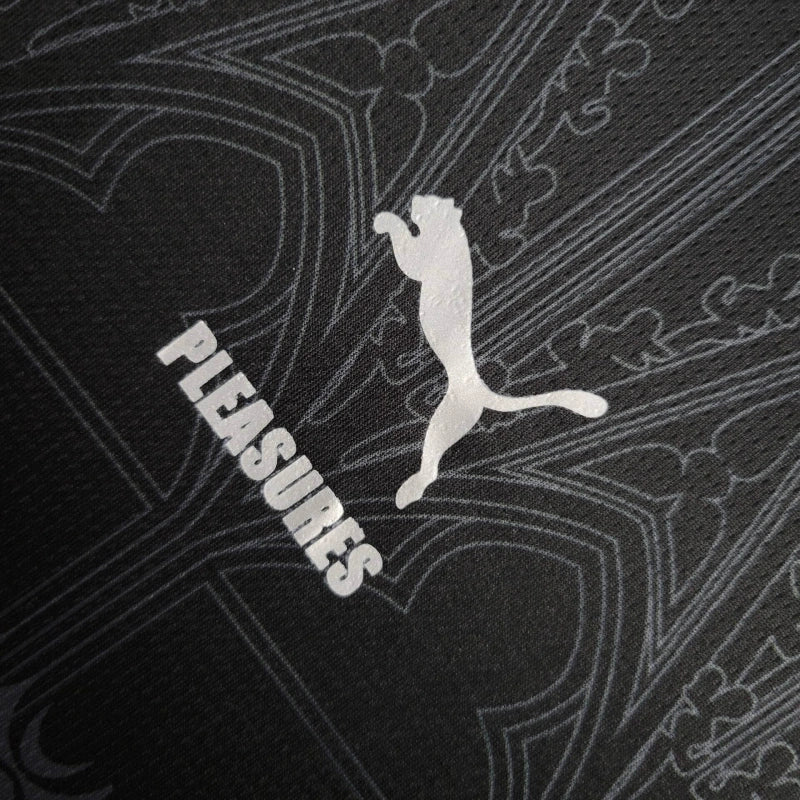 A Camisa 4 AC Milan x Pleasures 2023/24 – Versão Torcedor é uma colaboração entre o AC Milan, a PUMA e a marca de streetwear de Los Angeles, PLEASURES. Esta peça combina a tradição do futebol italiano com influências urbanas e contemporâneas.O design da camisa é predominantemente preto, com um padrão gráfico em cinza inspirado na arquitetura gótica da Catedral de Milão. A gola polo e os punhos seguem o mesmo padrão, conferindo um visual sofisticado e moderno. Os logotipos da PUMA e da PLEASURES estão presentes em cinza nas mangas e no lado direito do peito, enquanto o escudo do AC Milan é aplicado no lado esquerdo com efeito reflexivo.