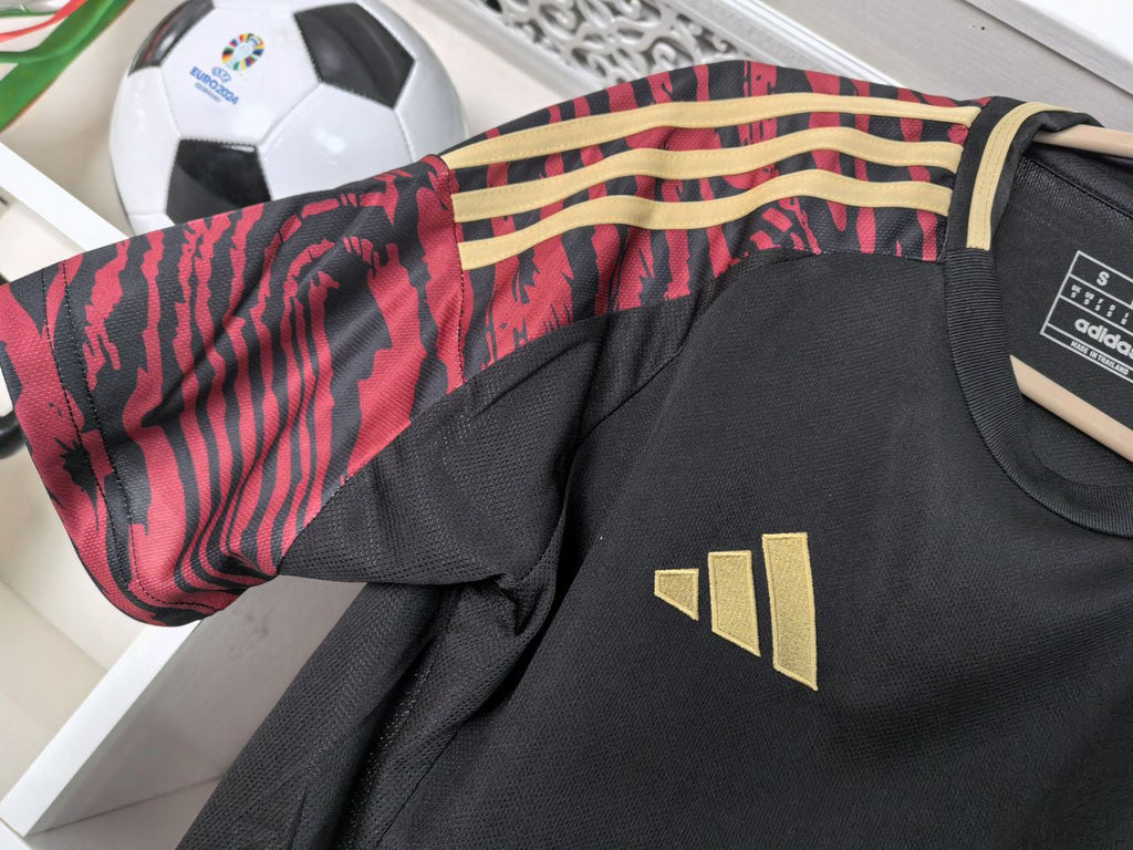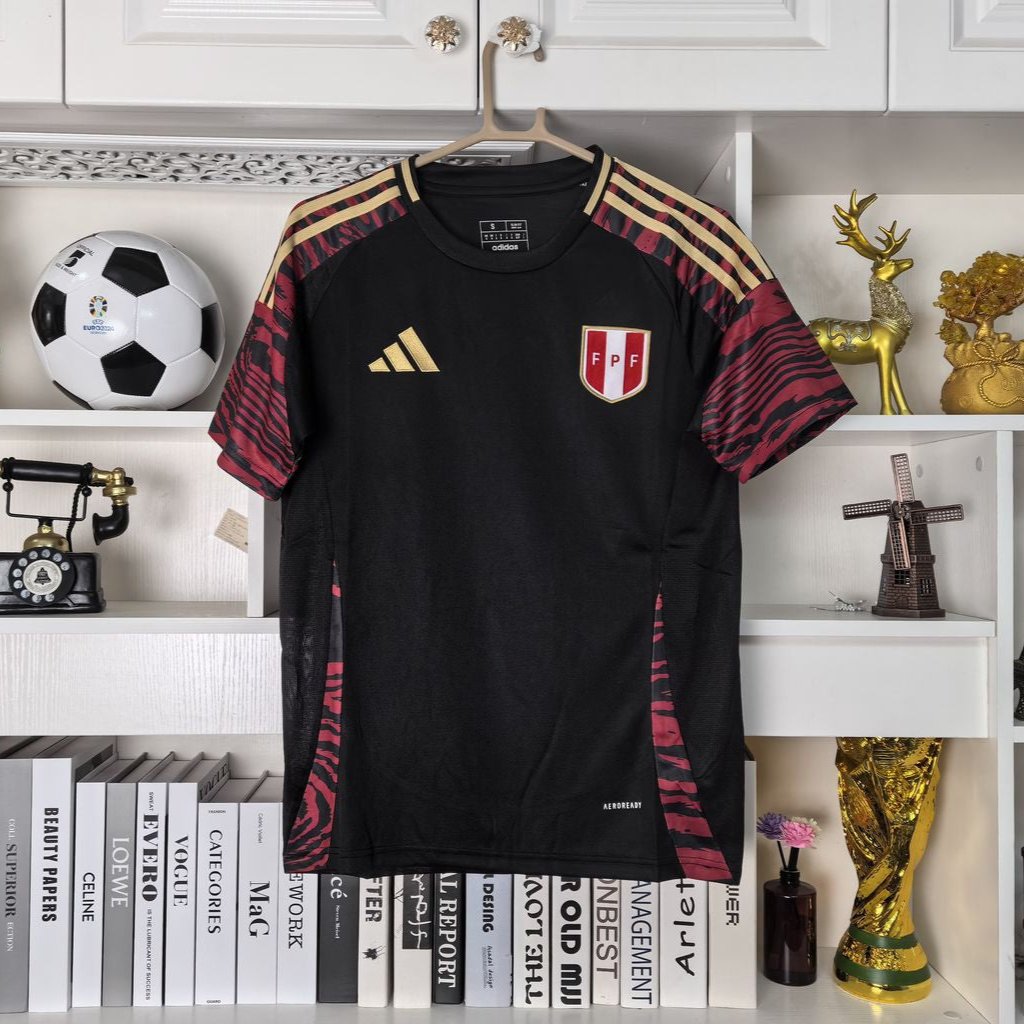 A camisa reserva do Peru para a temporada 2024/25 apresenta um design distinto e elegante, destacando-se pela sua combinação de cores e detalhes únicos. Inspirada na cultura peruana, a camisa possui uma base preta com detalhes em vermelho bordô nas mangas e nos painéis laterais, criando um efeito gráfico especial. As logos da Adidas e as icônicas Três Listras nos ombros são douradas, adicionando um toque sofisticado ao design.
