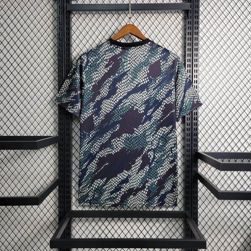 A Camisa Arsenal x Maharishi 2023/24 é uma colaboração especial entre o Arsenal Football Club, a marca de streetwear londrina Maharishi e a adidas. Este modelo foi desenvolvido para uso pré-jogo, combinando estilo urbano com desempenho esportivo. O destaque da camisa é o padrão de camuflagem personalizado, denominado “DPM: Bonsai Dragon Scales”, inspirado no Ano Lunar do Dragão. Este design exclusivo reflete a estética utilitária da Maharishi, incorporando elementos culturais e artísticos. A gola é do tipo polo na cor preta, complementando o visual arrojado da peça.