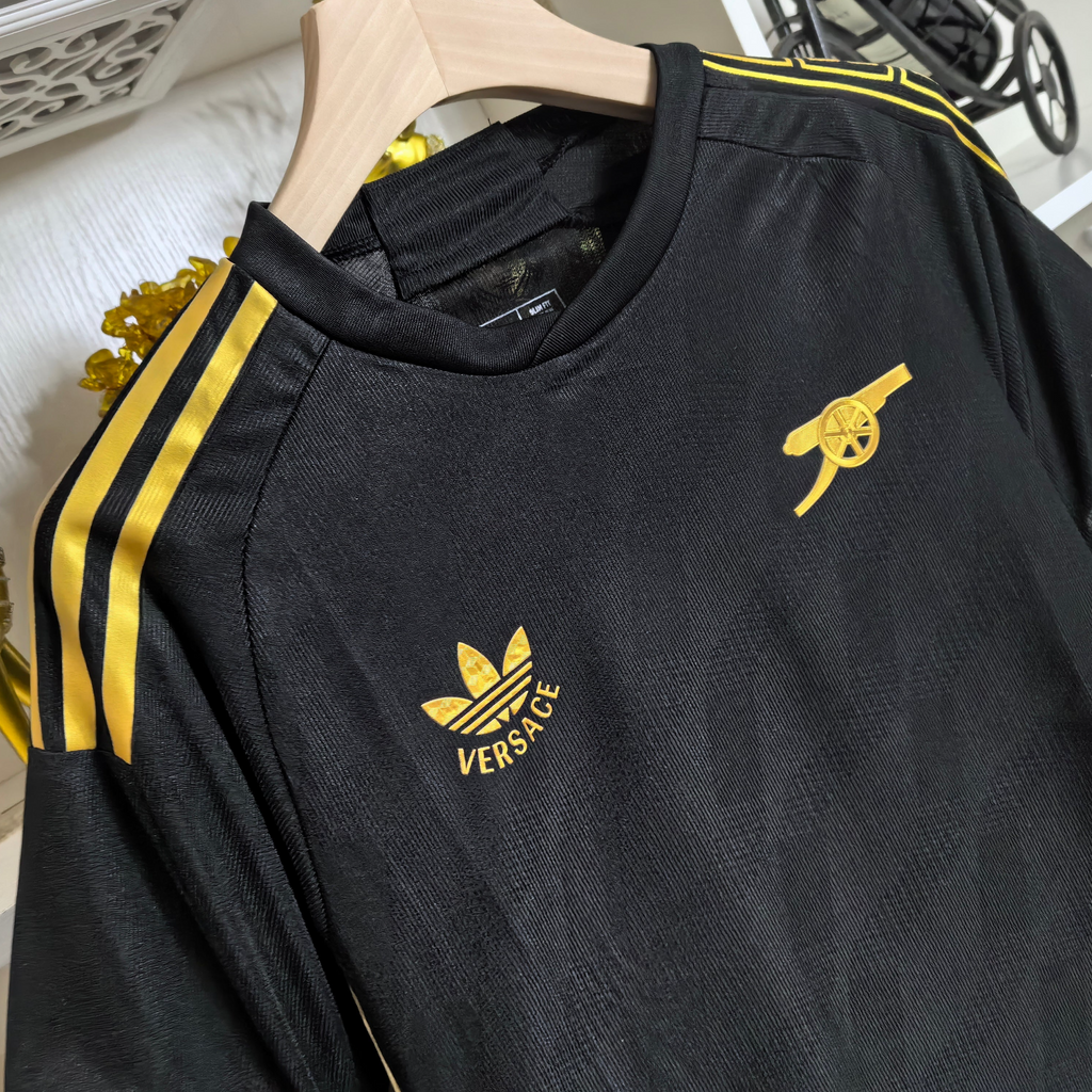 • Logotipos: O logo do Arsenal e da Versace são discretamente incorporados ao design, demonstrando a união das duas marcas.