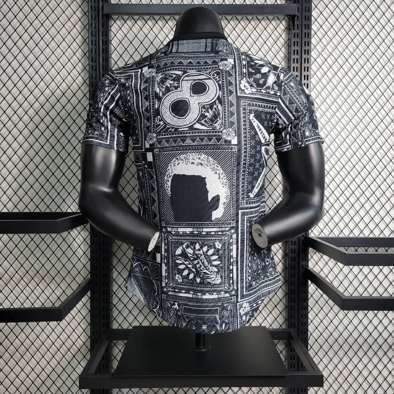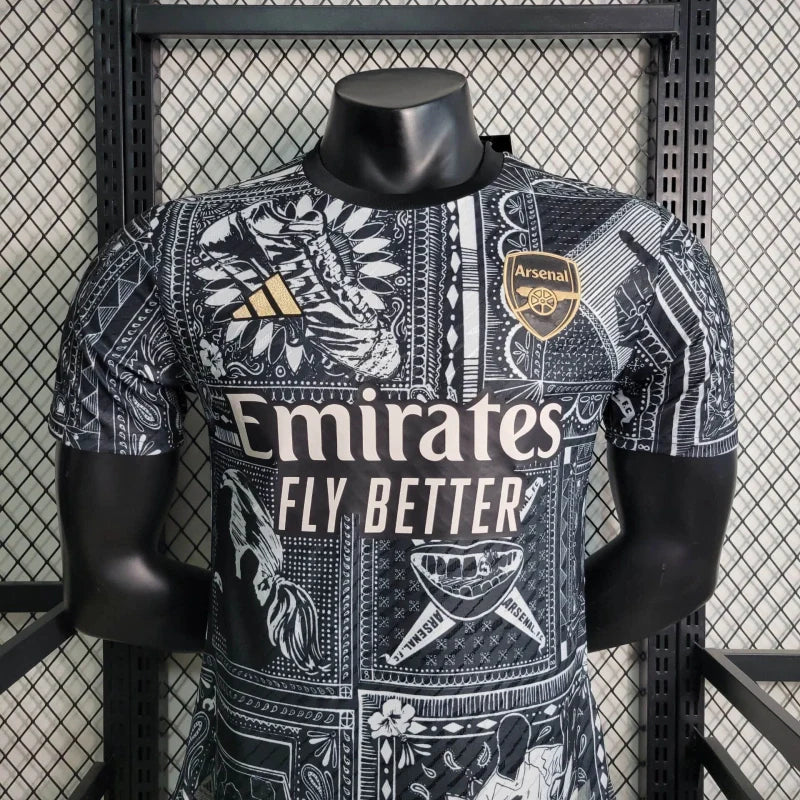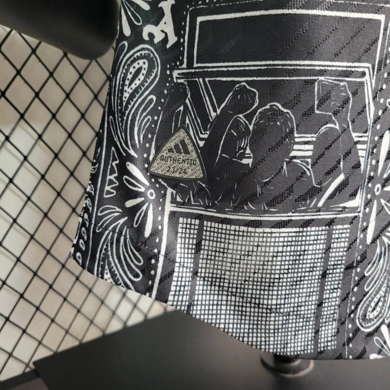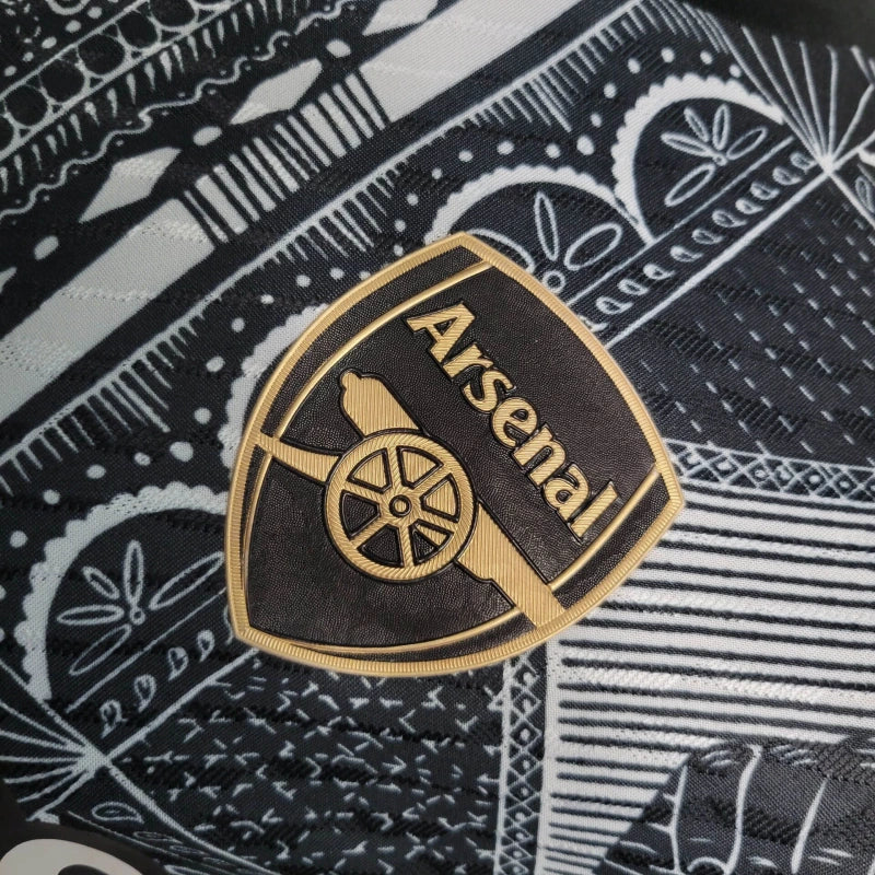 A Camisa Pré-Jogo Arsenal Ian Wright 2024/25 Jogador, desenvolvida pela adidas, é uma edição especial que homenageia a lenda dos Gunners, Ian Wright. O design apresenta gráficos marcantes em preto e branco com detalhes dourados, incluindo o escudo do clube e o logotipo da adidas. A estampa é inspirada em momentos icônicos da carreira de Wright, celebrando seu legado no Arsenal.