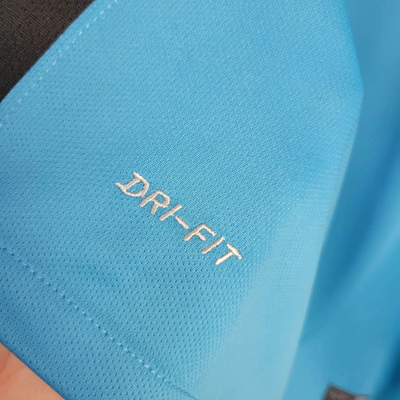 A terceira camisa do FC Barcelona para a temporada 2015/2016, conhecida como "Night Rising", destaca-se por seu design marcante e detalhes que homenageiam a identidade do clube. Predominantemente em azul-turquesa, o manto apresenta um degradê preto nas mangas, conferindo um visual moderno e arrojado. O logotipo da Nike e as linhas laterais também são em preto, criando um contraste elegante. Na parte interna da gola, encontra-se o lema "Més Que Un Club" ("Mais do que um clube"), reforçando o orgulho e a tradição do Barcelona. Além disso, uma pequena bandeira da Catalunha está presente na extremidade da manga direita, simbolizando a conexão regional do clube.