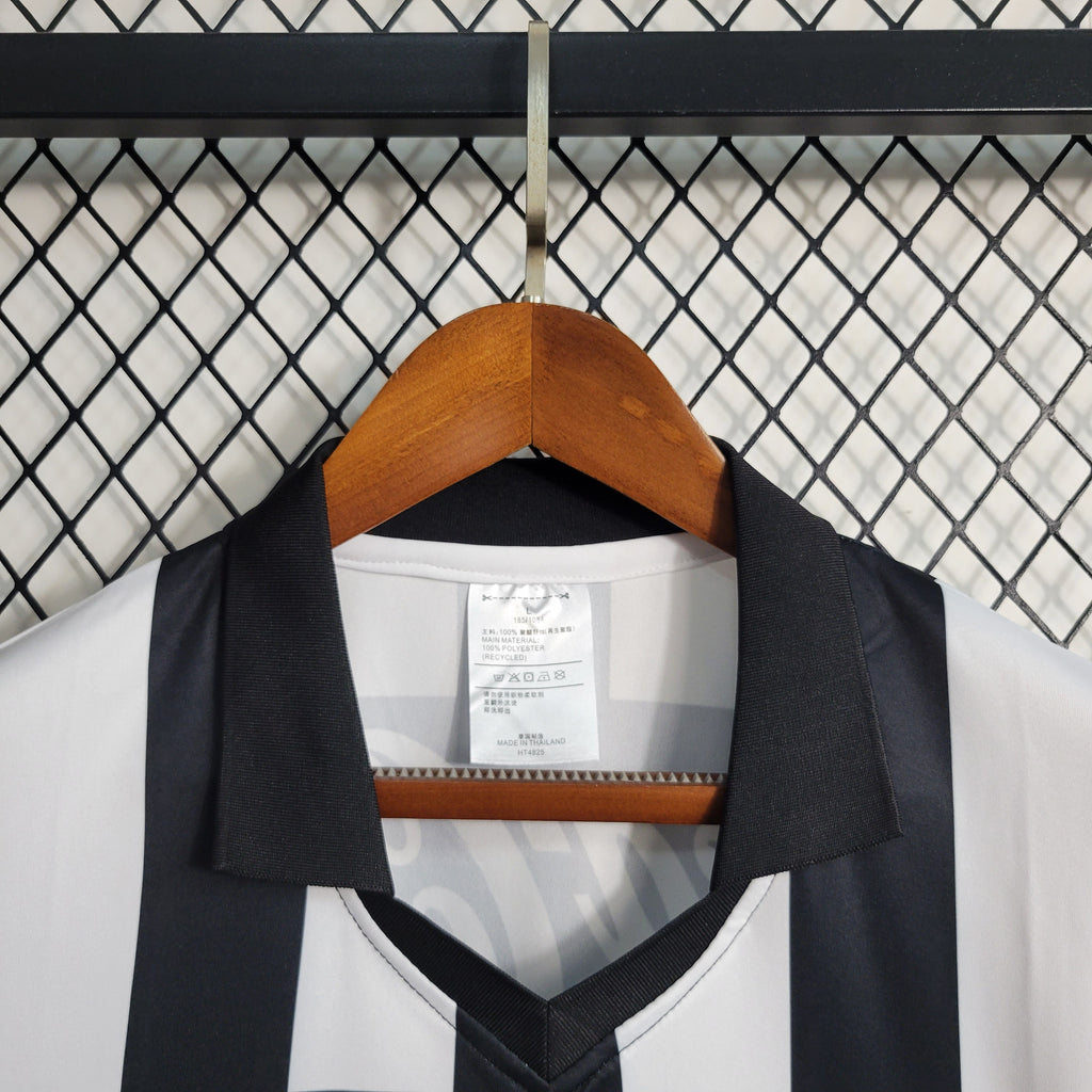 O modelo apresenta as clássicas listras verticais em preto e branco, simbolizando a identidade única e histórica do clube. O escudo do Botafogo é destacado no peito, ao lado do logotipo da fornecedora de material esportivo Finta, que remete diretamente à década de 1990. Outro detalhe marcante é o patrocínio da Seven Up, um dos símbolos daquela época, trazendo um toque extra de nostalgia.