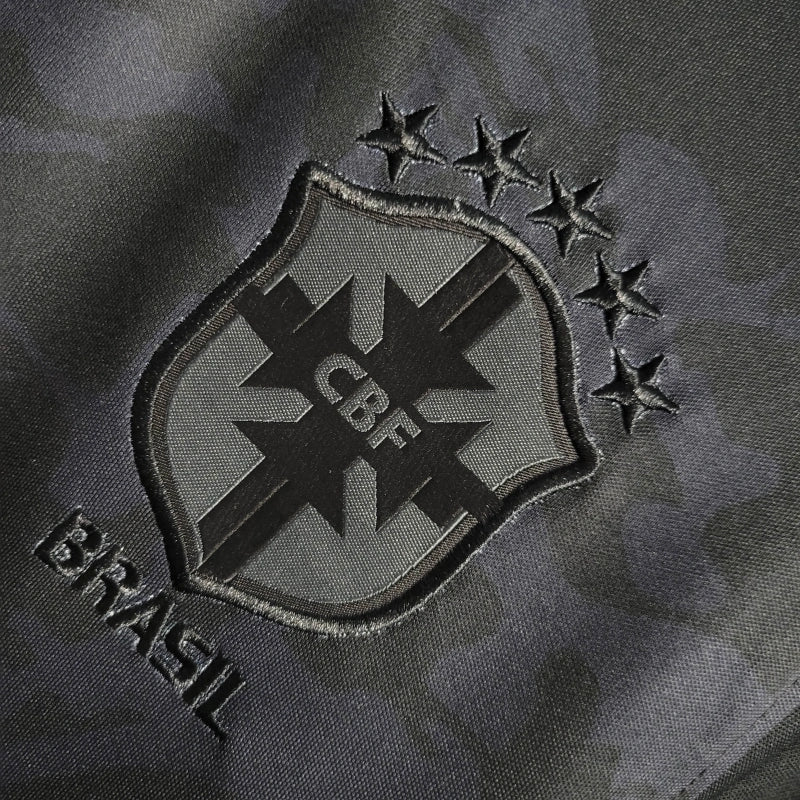 A camisa Brasil Edição Especial All Black 2022 é uma peça exclusiva que exala modernidade e imponência. Com um design monocromático sofisticado, ela apresenta um tom preto total, incluindo o escudo da CBF e o logo da Nike, criando um visual clean e impactante.