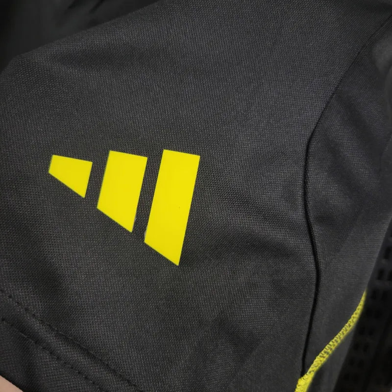 Ela é predominantemente preta, confeccionada em material leve e respirável, garantindo conforto e liberdade de movimento. Detalhes em amarelo trazem um contraste vibrante e moderno, reforçando a identidade visual da temporada.