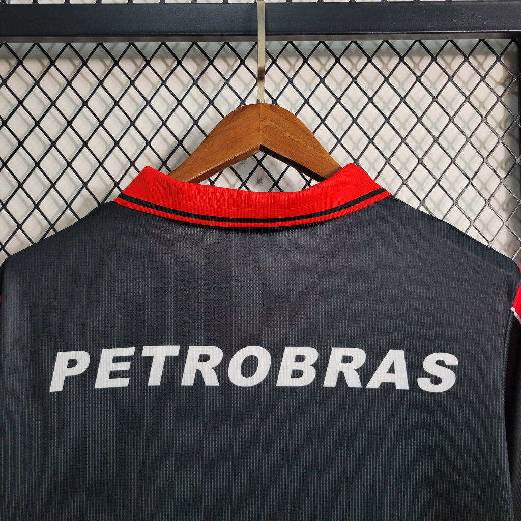 A Camisa 3 do Flamengo de 1999, fabricada pela Umbro, destaca-se por seu design predominantemente preto, complementado por detalhes em vermelho e branco. O escudo do clube é bordado no peito, assegurando autenticidade e qualidade. O tecido, composto por 100% poliéster, oferece leveza e conforto ao torcedor. Além disso, o material brilhante e reluzente remete às características das camisas da época, proporcionando um toque nostálgico.