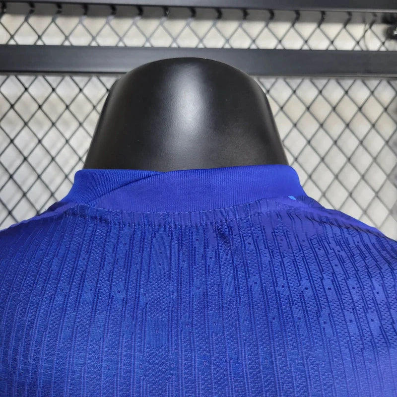 O escudo do Chelsea e o logotipo da Nike aparecem com efeito 3D em azul claro e bordas laranjas, destacando o design moderno. Confeccionada com a tecnologia Dri-FIT ADV, a camisa proporciona conforto e desempenho de alto nível, com ajuste perfeito e respirabilidade ideal. Este modelo, na versão jogador, utiliza tecido mais leve e tecnologias avançadas para melhor desempenho em campo.