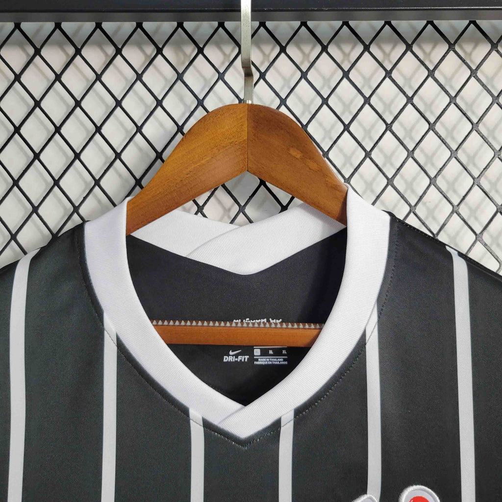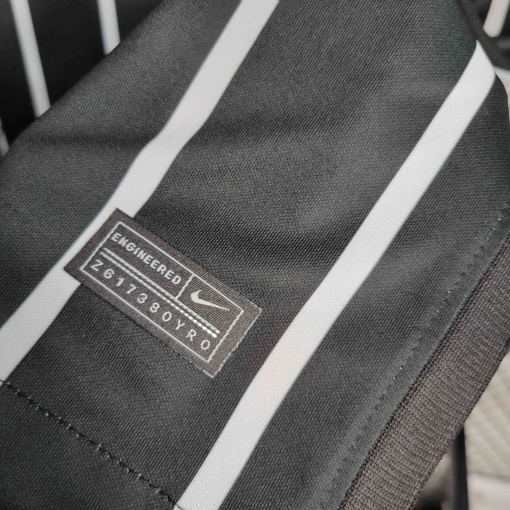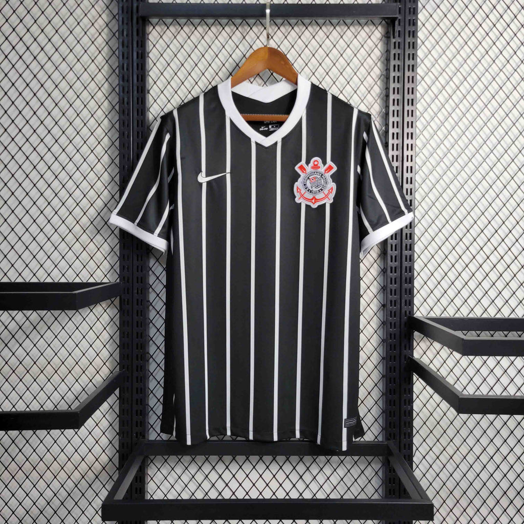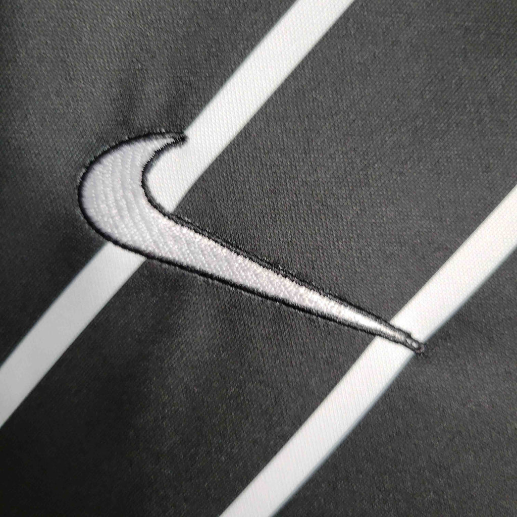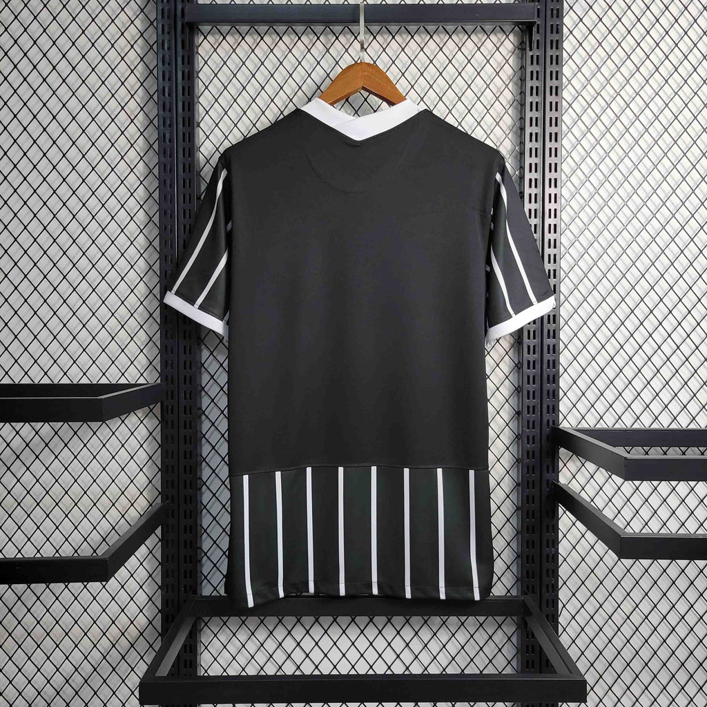 A camisa 2 do Corinthians da temporada 2020/21 é um uniforme que combina tradição e modernidade, celebrando o manto alvinegro que tanto representa a história do clube. Predominantemente preta, a camisa apresenta listras brancas verticais, em um design que remete ao estilo clássico dos anos 90, mas com um toque contemporâneo. A gola é em formato polo, trazendo elegância, enquanto o escudo do clube aparece bordado, acompanhado do logotipo da Nike em branco, garantindo qualidade e autenticidade.