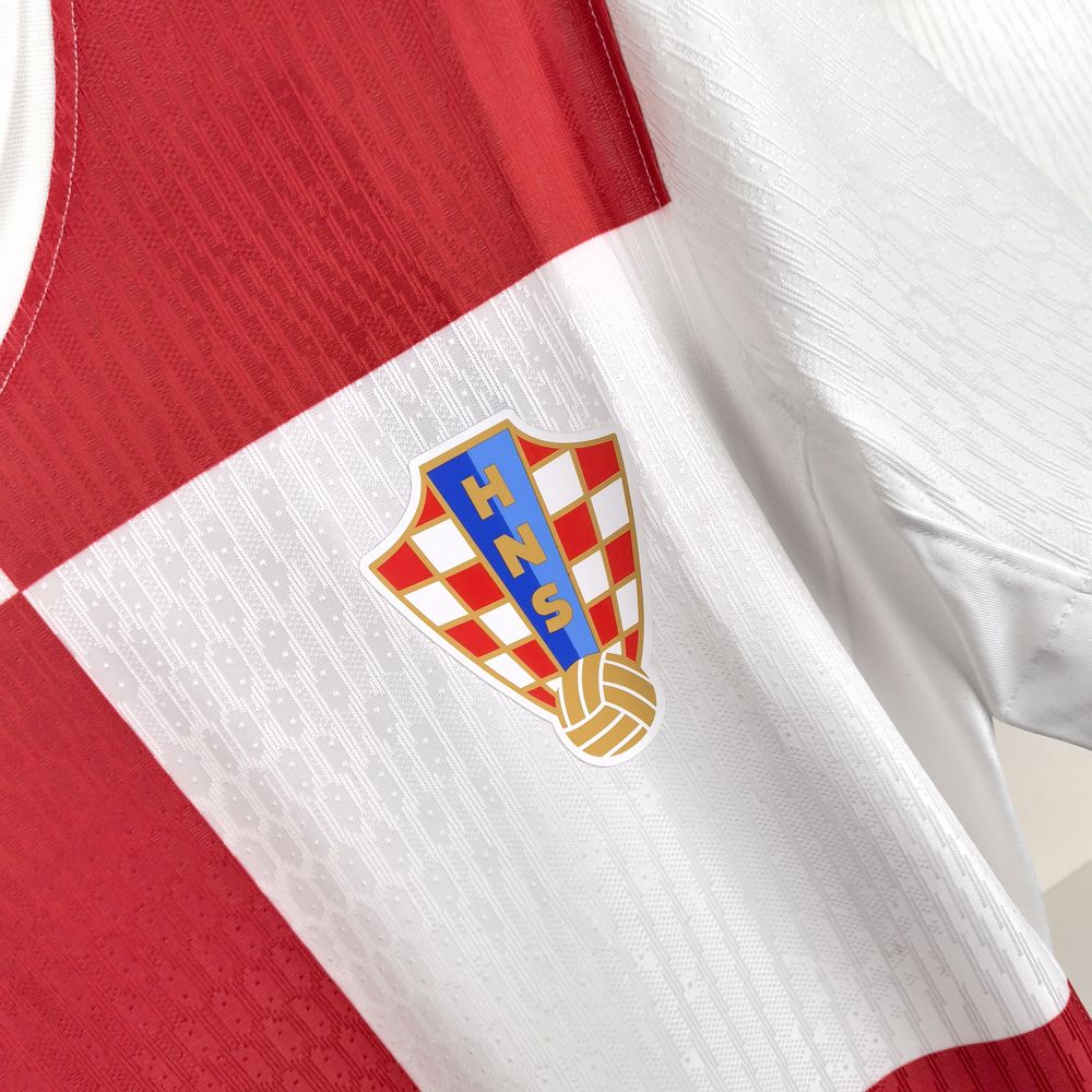 A camisa Home da Croácia 24/25 Jogador, destaca seu design inovador e os materiais de alta performance utilizados. A camisa apresenta os icônicos quadrados vermelhos e brancos, agora maiores, para formar a bandeira tanto nas arquibancadas quanto no campo. A gola polo canelada adiciona um toque de estilo. No interior da gola, há um logo com a palavra "Obitelj/Family", simbolizando a unidade da equipe e dos fãs.