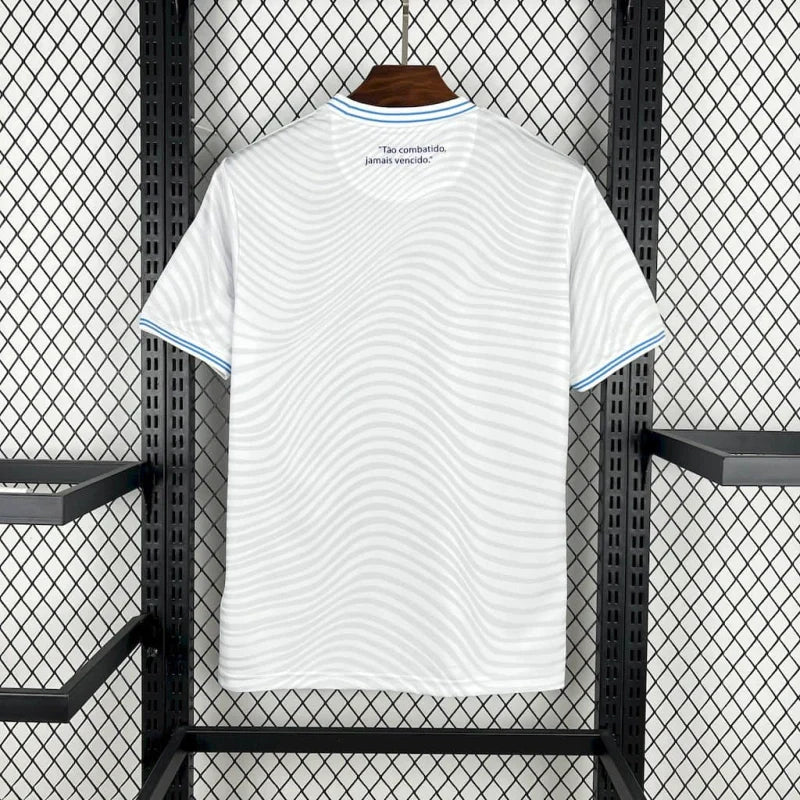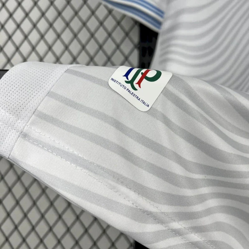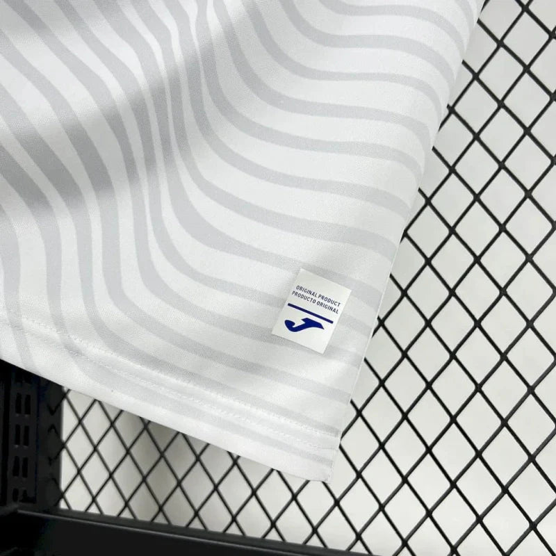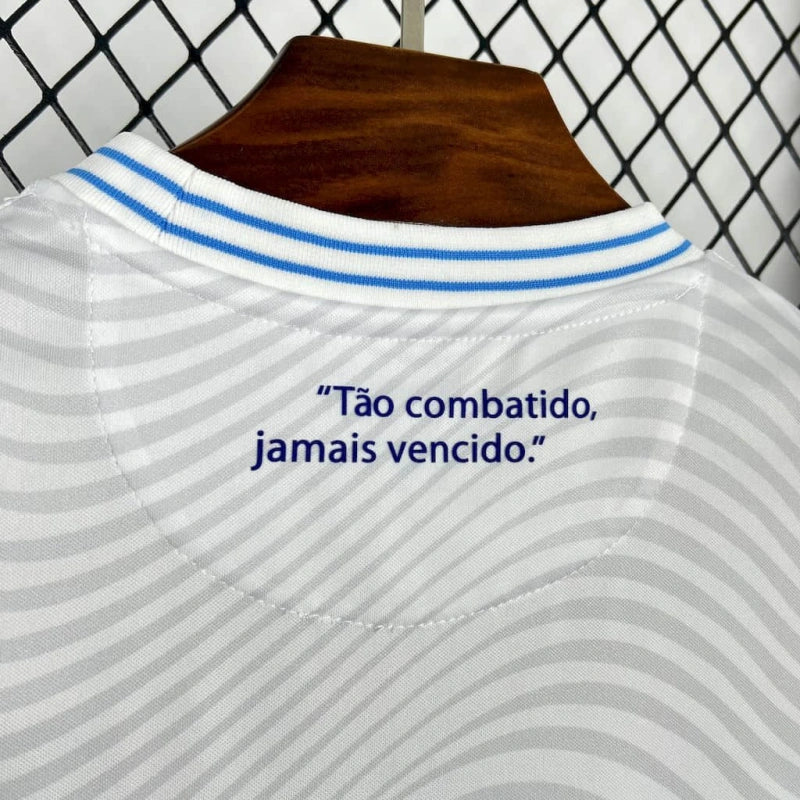 A Camisa 2 do Cruzeiro Futsal para a temporada 2025/26, desenvolvida pela fornecedora espanhola Joma, apresenta um design que combina tradição e modernidade. Predominantemente branca, a camisa possui detalhes em azul nos ombros, laterais e recortes no peito, criando um contraste marcante. A gola é redonda na cor branca, mantendo a elegância do uniforme. O escudo completo do Cruzeiro, com a inscrição "Futsal" abaixo, está aplicado no lado esquerdo do peito, enquanto o logotipo da Joma aparece no lado direito. O conjunto é complementado por calção azul e meiões brancos. Além disso, todas as versões do uniforme trazem um patch do Instituto Palestra Itália, reforçando a conexão com as origens do clube.