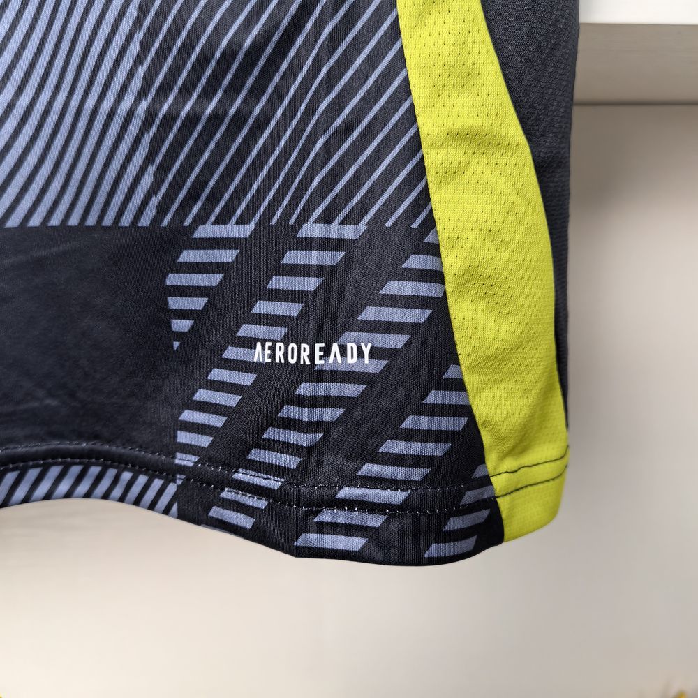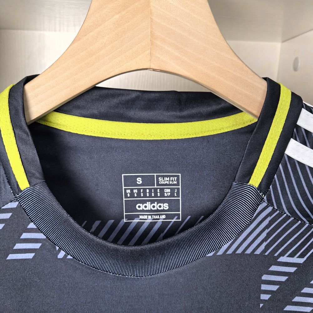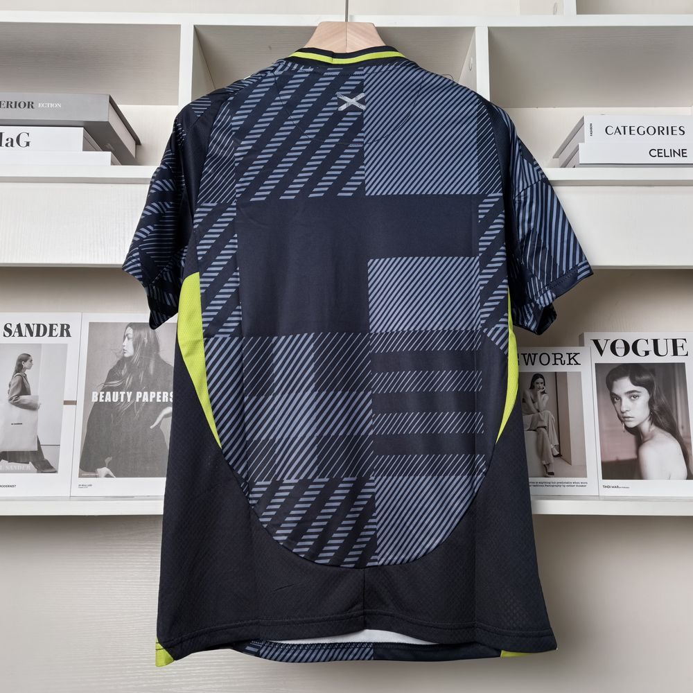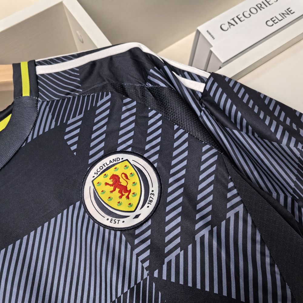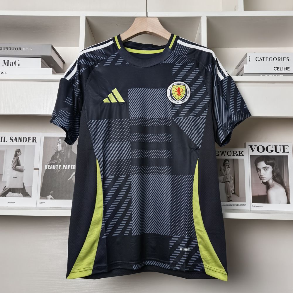 A camisa Home da Escócia para a temporada 24/25, produzida pela Adidas, é predominantemente azul marinho e apresenta um design com grafismos que remetem ao tartã, um símbolo nacional da Escócia. Feita em poliéster, a camisa utiliza a tecnologia AeroReady, que controla o excesso de umidade do corpo, garantindo rápida secagem do suor durante os exercícios. O escudo da seleção está bordado no tórax, e a camisa possui gola careca e mangas curtas.