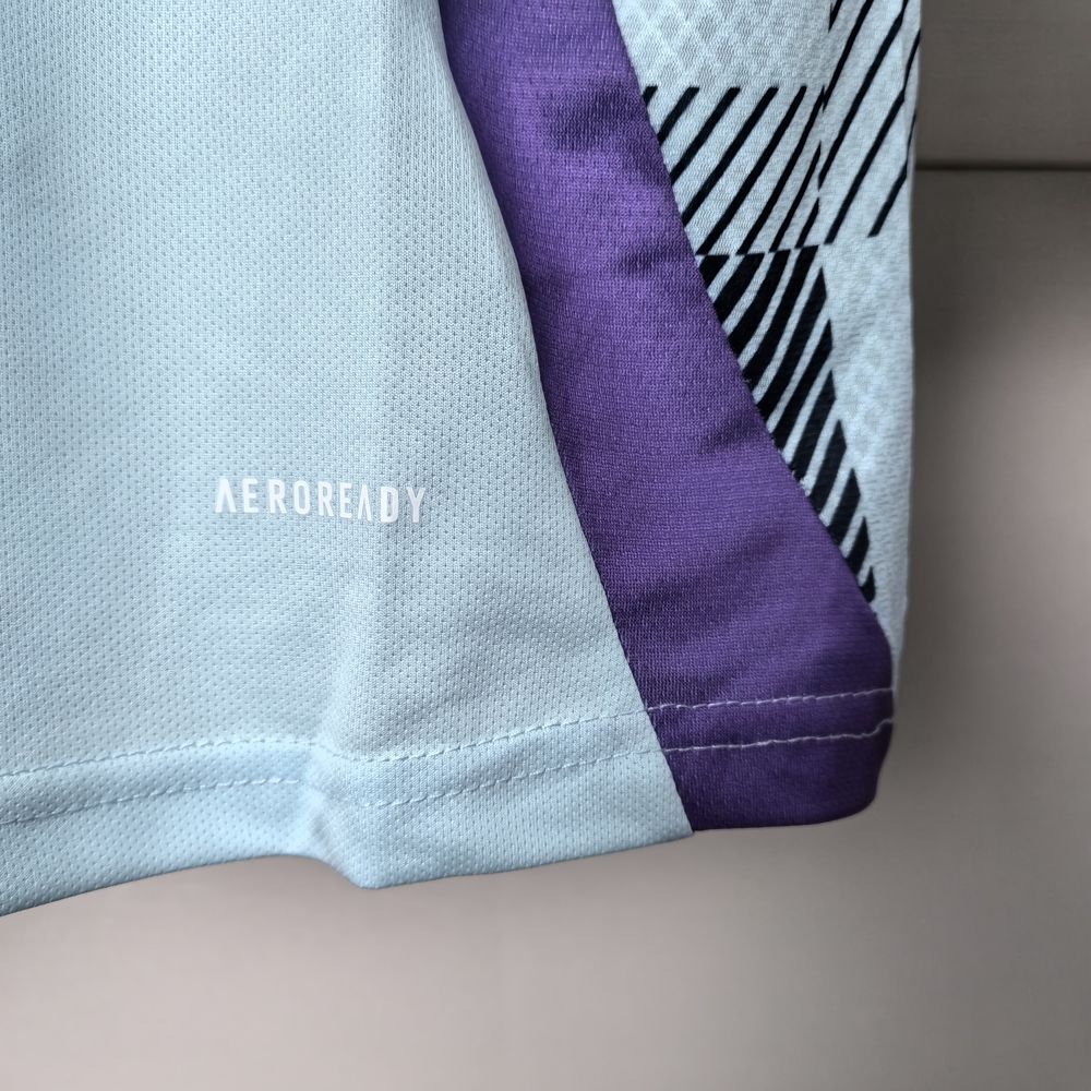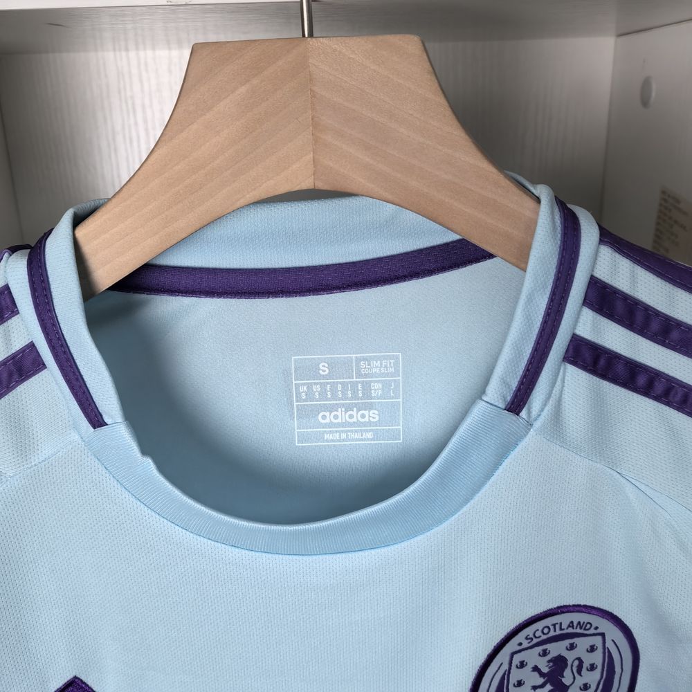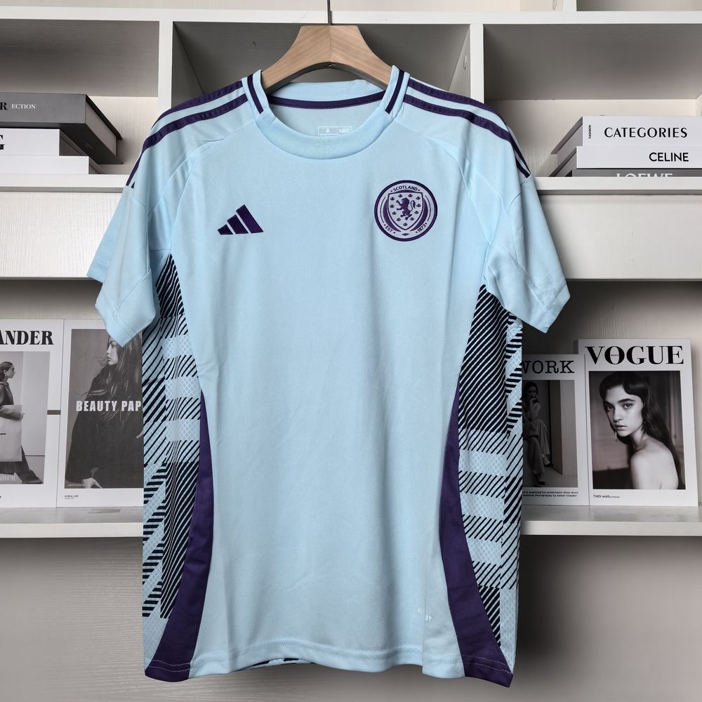 A camisa Away da Escócia para a temporada 24/25, produzida pela Adidas, é predominantemente azul menta com detalhes em azul marinho e branco. Feita de poliéster reciclado, a camisa utiliza a tecnologia AeroReady, que absorve o suor e mantém o corpo seco e confortável. O design moderno e fresco é inspirado nas paisagens serenas e nas cores vibrantes da Escócia1.
