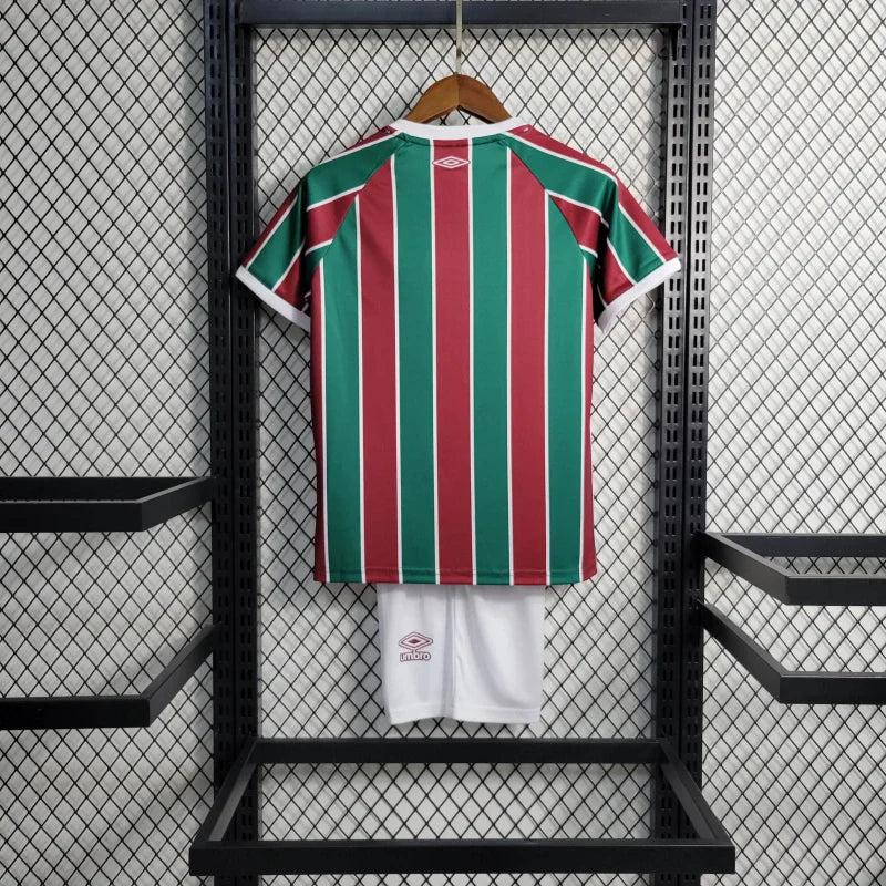 O Conjunto Infantil Fluminense I 2023/24, produzido pela Umbro, é ideal para os pequenos torcedores demonstrarem sua paixão pelo Tricolor. Este kit inclui uma camisa de mangas curtas com as tradicionais listras verticais em verde e grená, separadas por linhas brancas, além de um calção branco com cós elástico e cordão interno para ajuste confortável. Ambas as peças são confeccionadas em 100% poliéster, garantindo durabilidade e conforto.