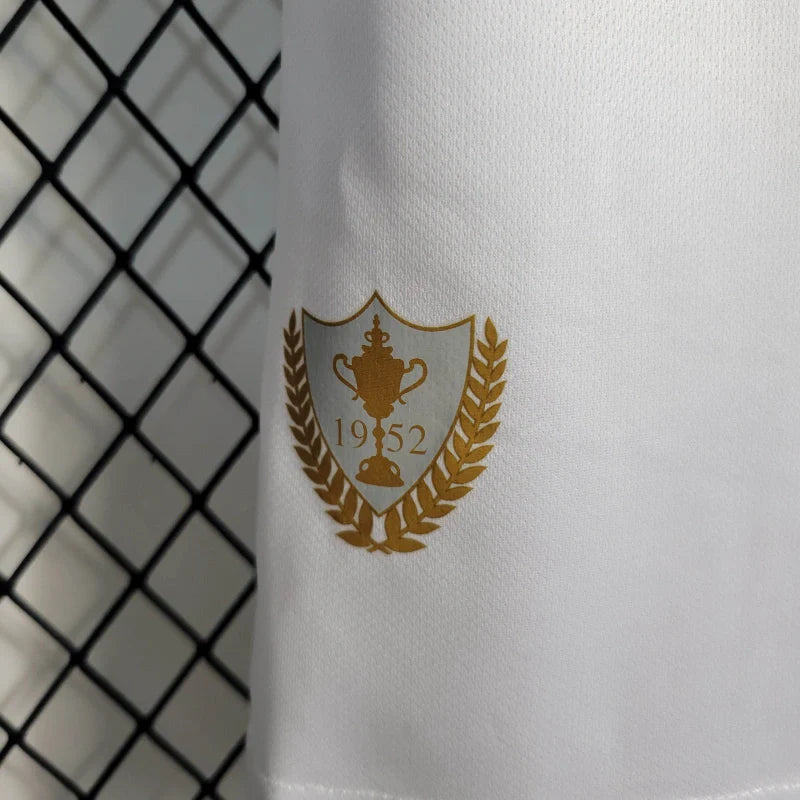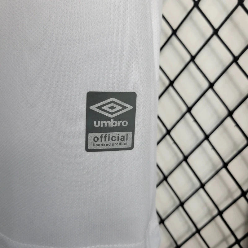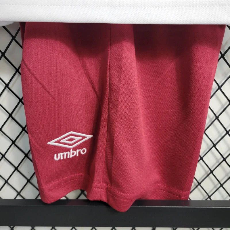 O conjunto é confeccionado em 100% poliéster, garantindo conforto e durabilidade para os pequenos torcedores. A camisa possui mangas curtas e gola em formato V, enquanto o calção conta com cós elástico e cordão interno para um ajuste adequado.