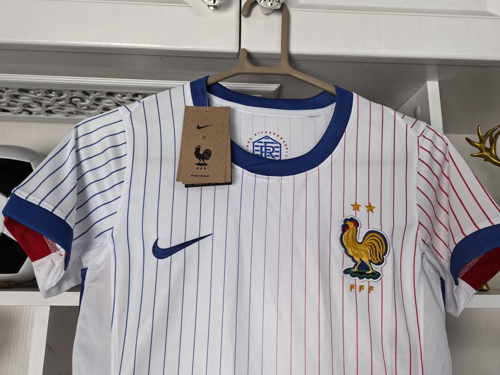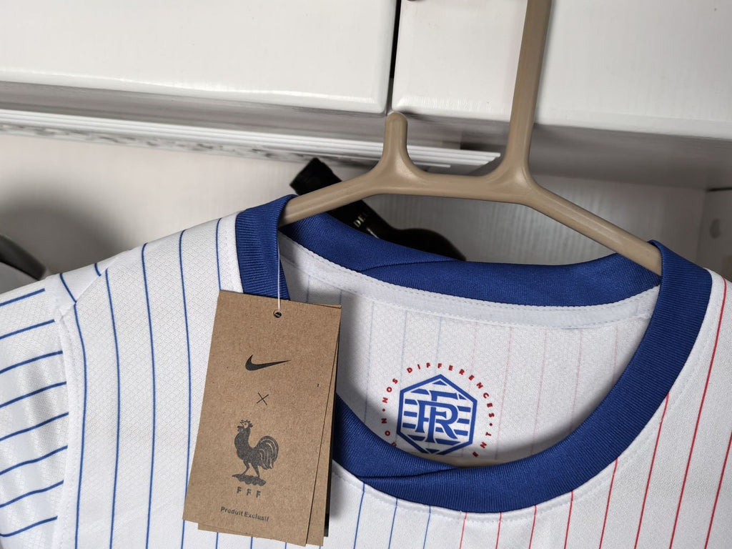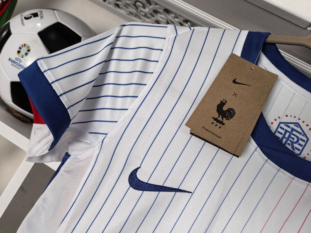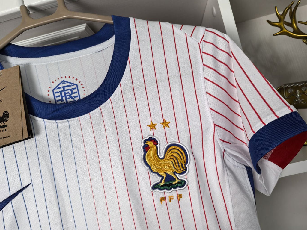 A camisa Away da França 2024 da Nike combina a moda francesa com a tradição do futebol. O design apresenta listras clássicas, inspiradas nas camisas da França das décadas de 1980 e 2000. O escudo do Cockerel é destacado, celebrando o estilo vintage. A tecnologia Nike Dri-FIT ajuda a manter você seco e confortável, absorvendo o suor da pele para uma evaporação mais rápida.
