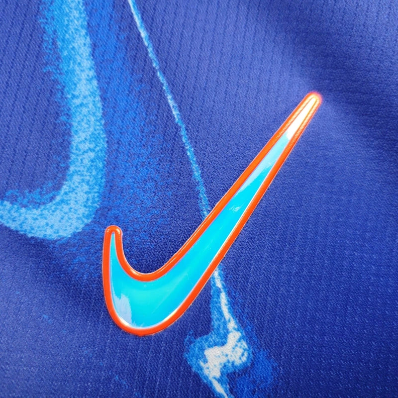 A camisa titular do Chelsea para a temporada 2024/25, produzida pela Nike, segue o tema "We Burn Blue" e apresenta um design inovador. Predominantemente em azul royal, a peça exibe um padrão ondulado inspirado nas chamas azuis, representando energia e paixão. Detalhes em laranja, presentes no contorno dos logos e nos punhos das mangas, adicionam um contraste vibrante ao design.