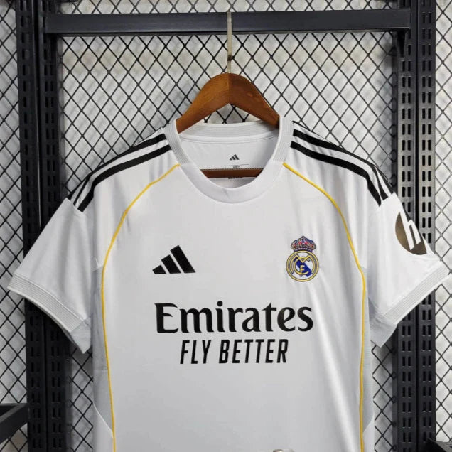 A tradição e a elegância do Real Madrid chegam com força total para a temporada 2025/26! Com um design icônico inspirado nos mantos históricos de 2009/10 e 2015/16, a nova camisa traz o branco clássico, agora com detalhes dourados que simbolizam a grandeza do clube.