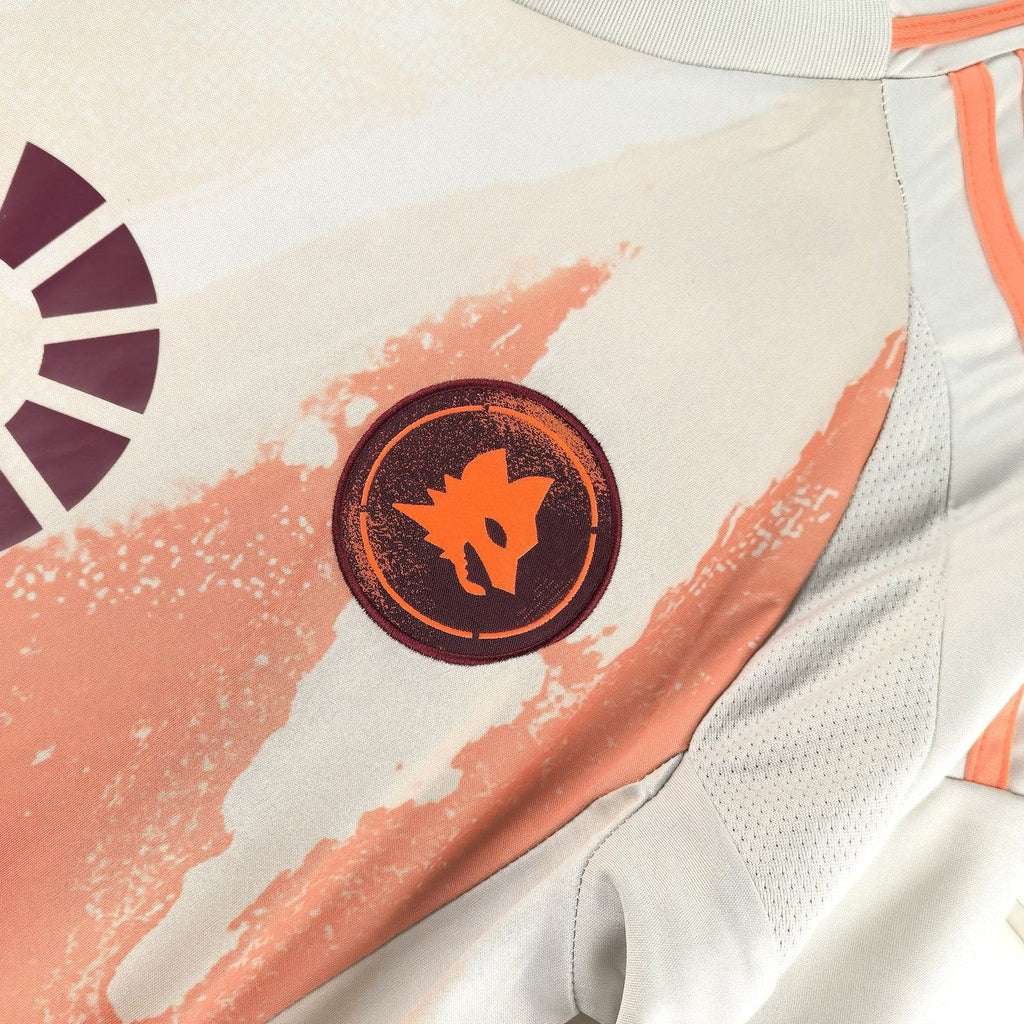 A camisa 2 da AS Roma para a temporada 2024/25, desenhada pela Adidas, apresenta um design inovador inspirado na herança cultural de Roma, com destaque para o bairro Testaccio. O uniforme reserva é predominantemente branco, com um padrão em estilo "spray" laranja que cobre a frente da camisa, remetendo às artes urbanas encontradas nos muros da cidade.