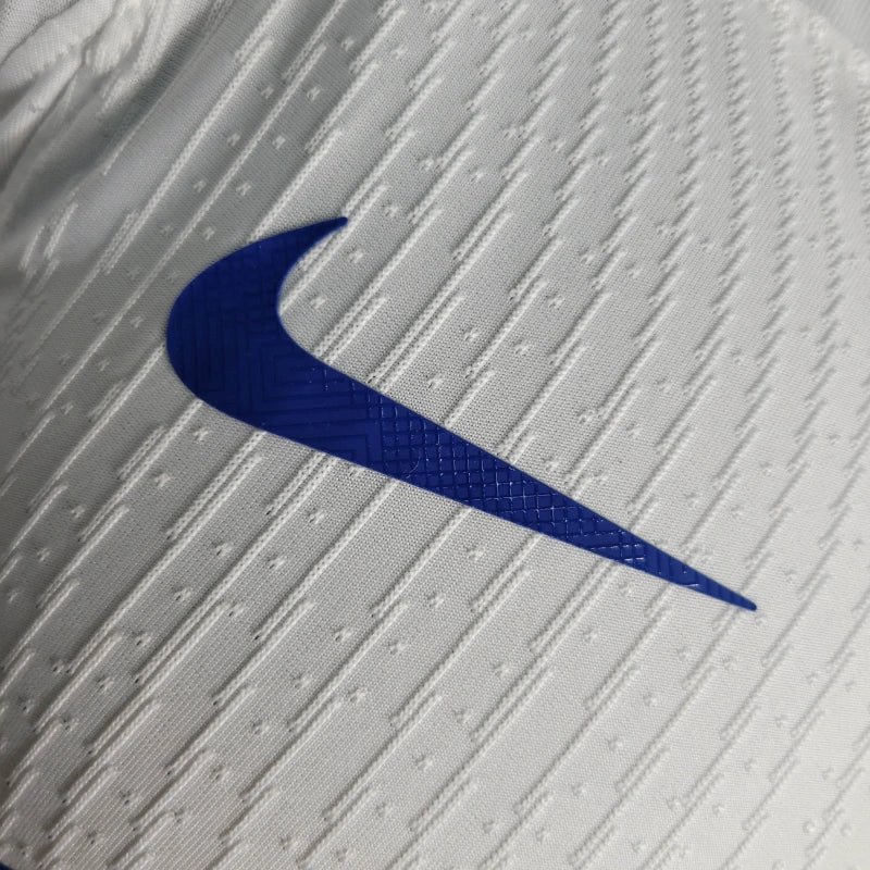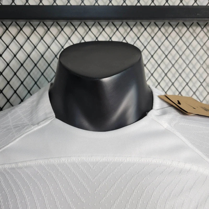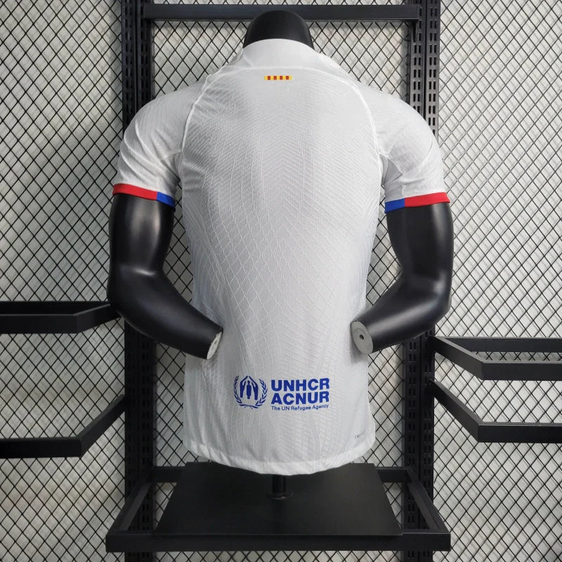 A segunda camisa do FC Barcelona para a temporada 2023/24 presta homenagem ao uniforme branco utilizado pelo clube em 1978, celebrando grandes nomes do desporto. O brasão presente na camisa é uma réplica do utilizado naquela época, e os detalhes canelados nas mangas fazem referência ao lendário capitão daquela equipe.