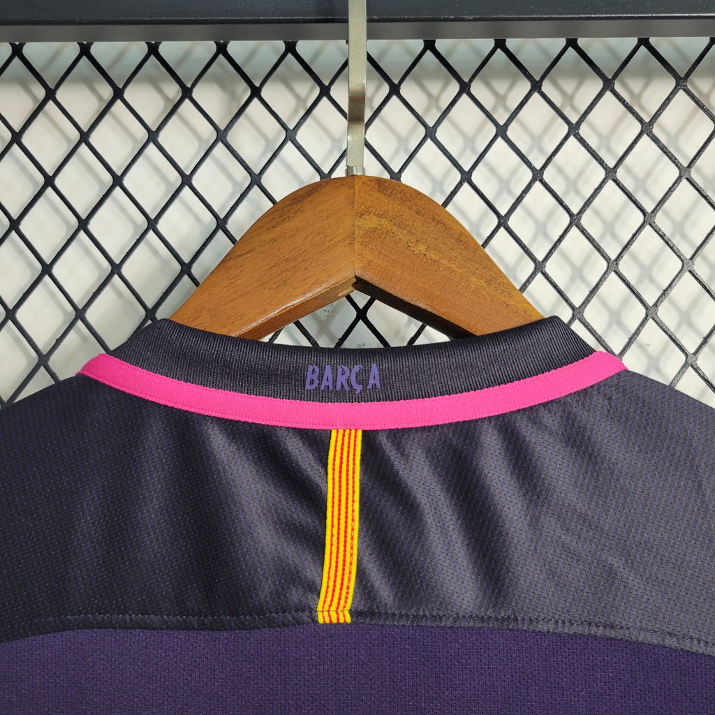 A Camisa II do FC Barcelona da temporada 2016/2017, desenvolvida pela Nike, destaca-se por seu design inovador e simbólico. Predominantemente roxa, a peça representa a fusão das tradicionais cores azul e vermelho do clube. As mangas apresentam um tom de azul mais escuro, enquanto detalhes em rosa são visíveis nas laterais e na parte posterior da gola, onde se lê "Barça". Abaixo da inscrição, uma faixa vertical em amarelo e vermelho homenageia as cores da Catalunha.