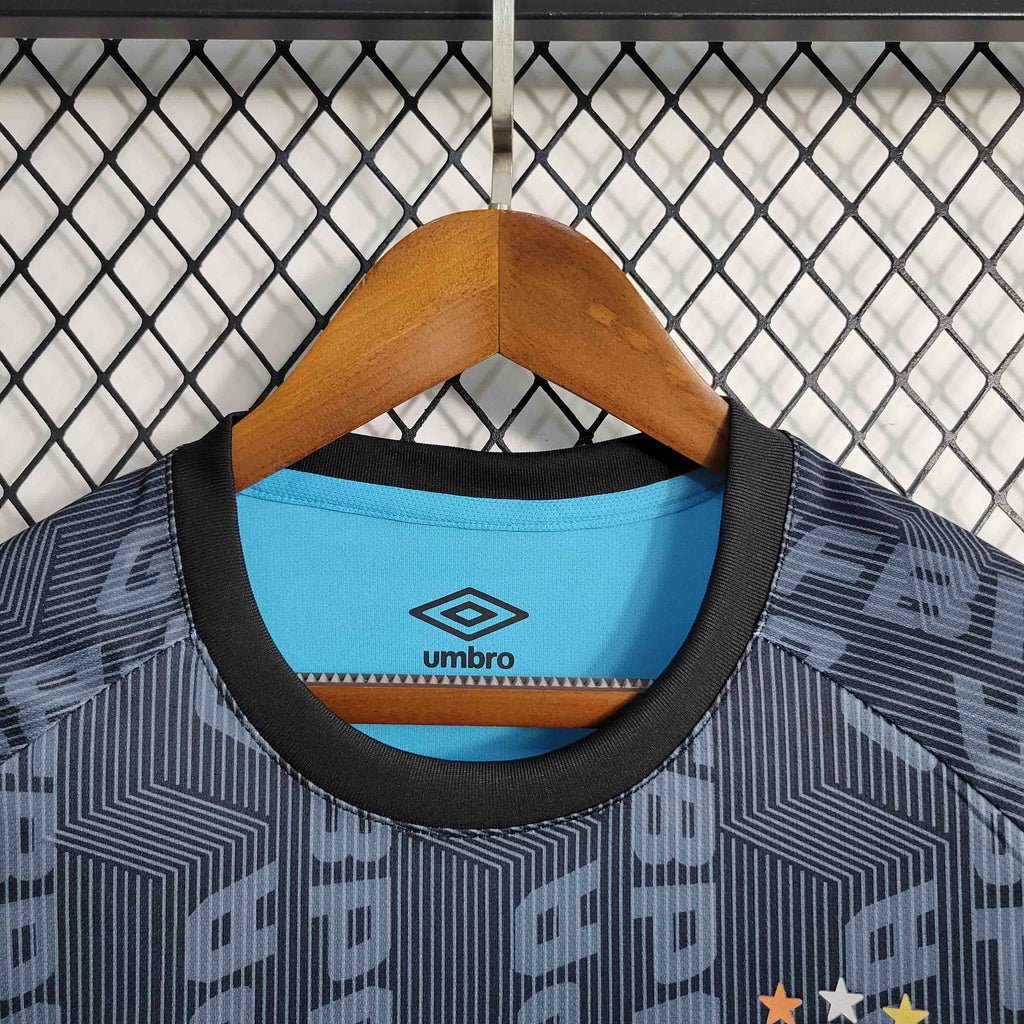 A Camisa de Treino 1 do Grêmio para a temporada 2023/24, desenvolvida pela Umbro, é confeccionada em 100% poliéster, garantindo leveza e conforto durante os treinos. O design apresenta gola redonda canelada e mangas curtas, proporcionando liberdade de movimento. O escudo do Grêmio é destacado no peito, reforçando a identidade do clube.