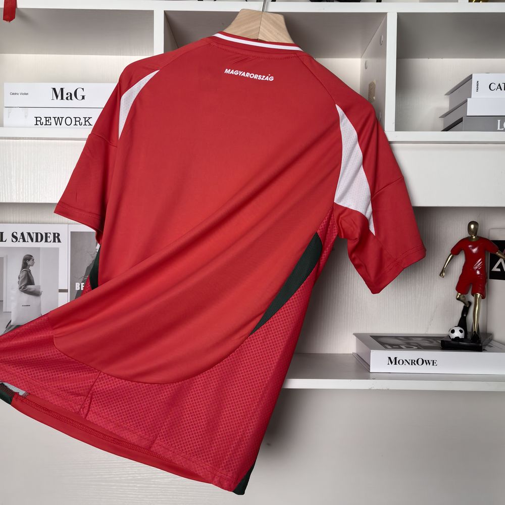A camisa 1 Hungria para a temporada 2024/25 é caracterizada por sua tradicional cor vermelha, complementada por detalhes em verde e branco. No centro do peito, encontra-se o logotipo branco da Adidas entre os dois distintivos de futebol húngaro, que são presença constante nos uniformes da seleção. Este design foi lançado especificamente para o Euro 2024, refletindo o orgulho e a identidade nacional húngara.