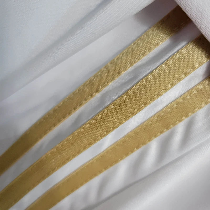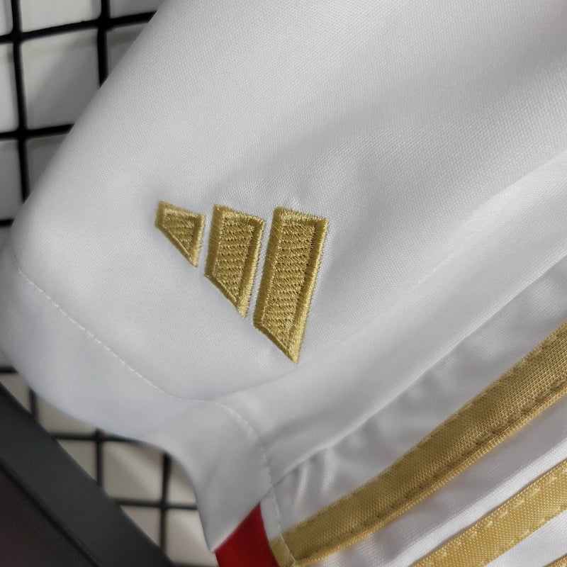 A camisa exibe o tradicional vermelho vibrante com mangas brancas e detalhes dourados, celebrando os 20 anos da época invicta de 2003/04 – uma homenagem à história gloriosa do clube. O escudo do Arsenal e o logótipo da Adidas estão presentes no peito, enquanto o patrocínio central mantém a autenticidade do visual.