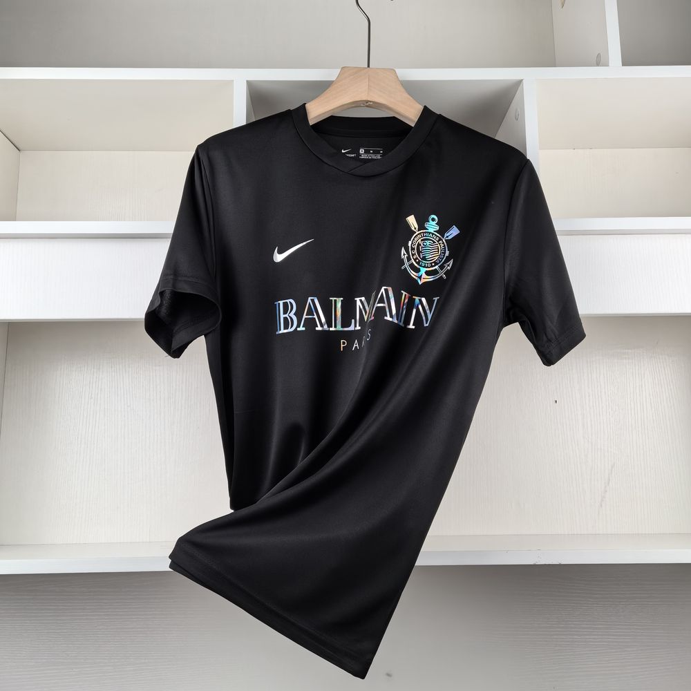 No peito, do lado esquerdo, está o emblemático escudo do Corinthians, refletindo a excelência e a nobreza dessa edição especial. O logotipo da Balmain Paris na parte central da camisa, em uma tonalidade que não interfere com o design sofisticado da peça.