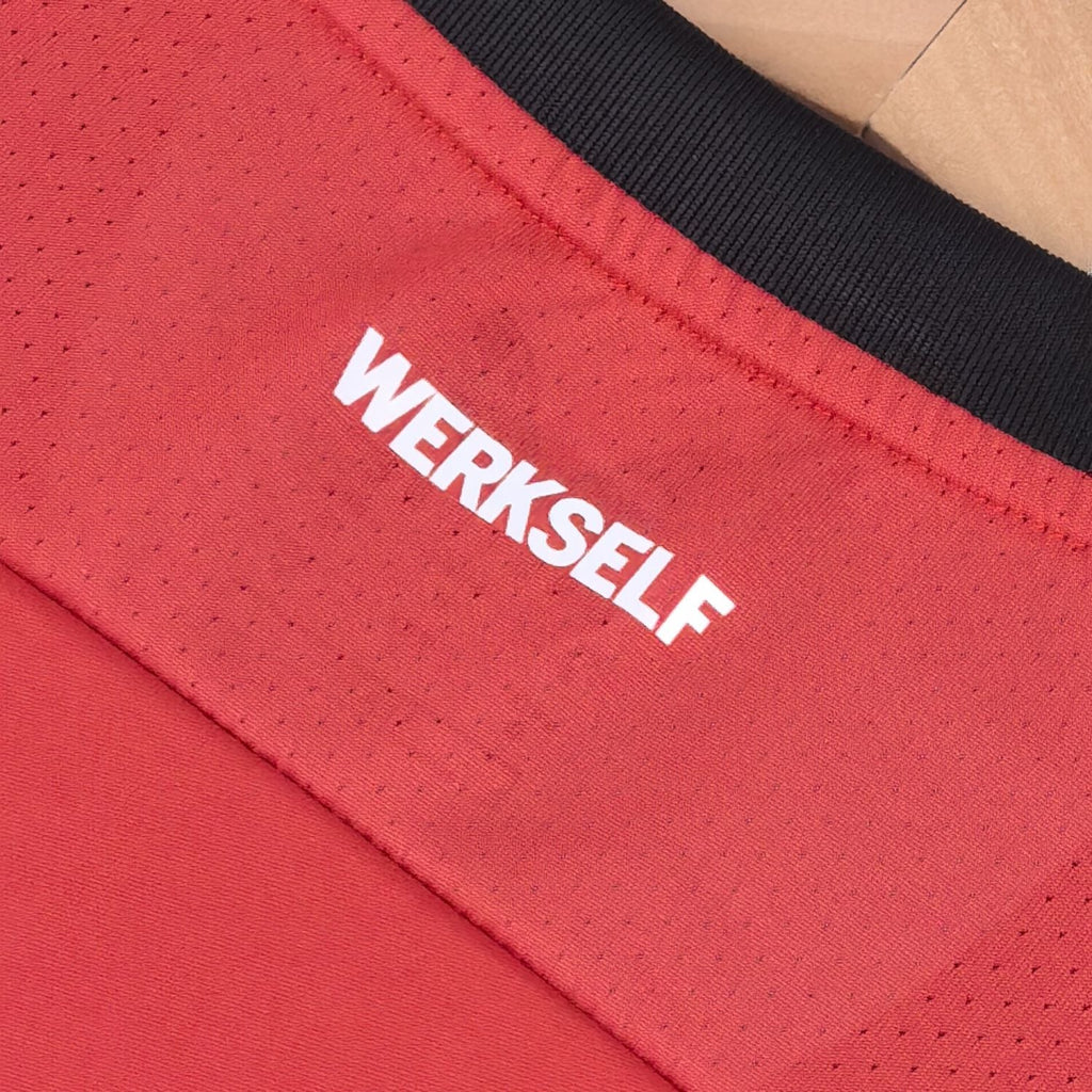 Com um corte reto e unissex, a camisa é um item essencial para a sua visita ao estádio. O logotipo do Bayer 04 destaca-se em um bordado vermelho no peito esquerdo, enquanto o peito direito exibe o logotipo bordado em branco da marca premium britânica Castore. A gola é adornada com as letras brancas 'Werkself'. O patrocinador principal, Barmenia, aparece em letras brancas no peito.