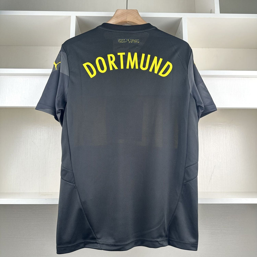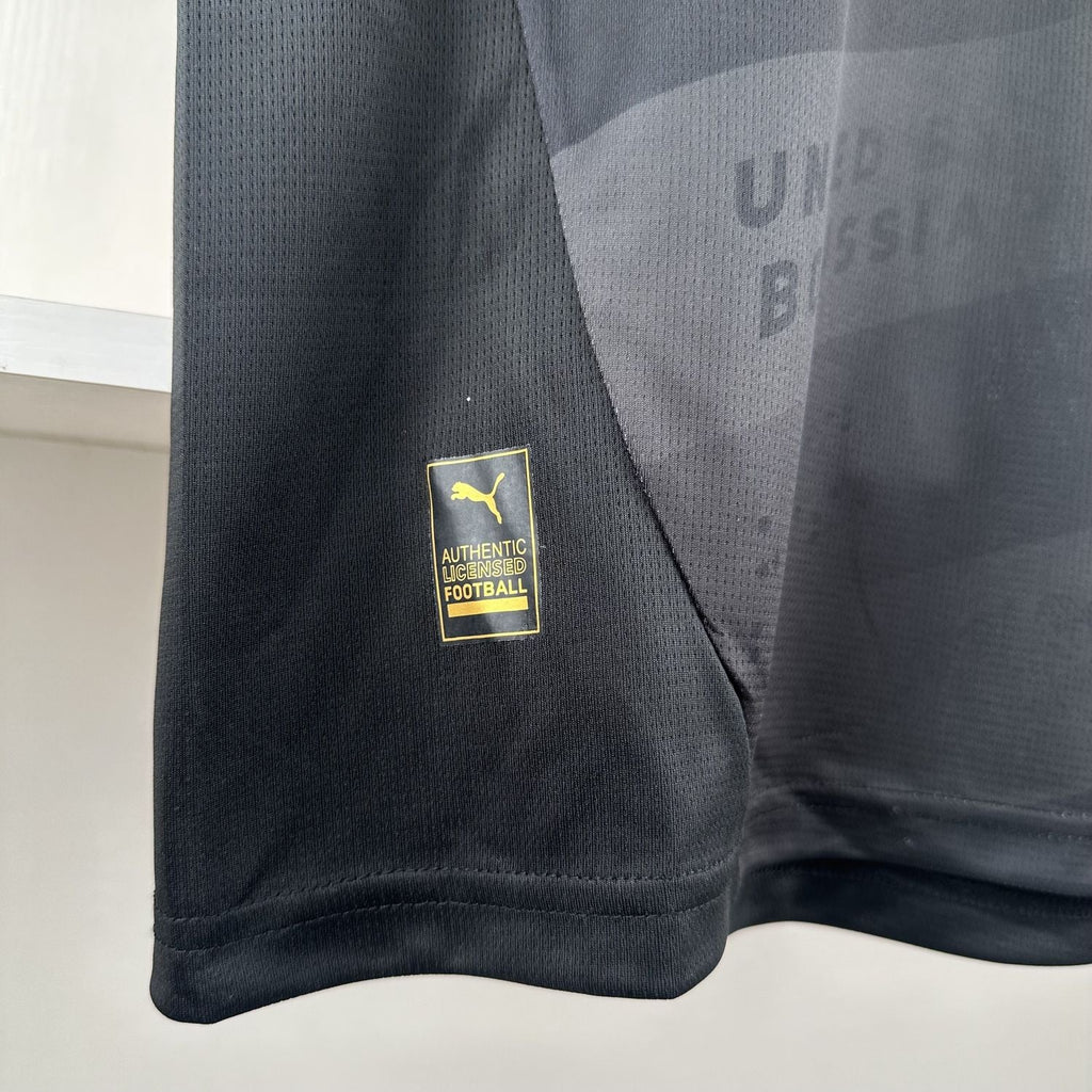 A camisa 2 do Borussia Dortmund para a temporada 2024/25, desenhada pela PUMA, tem um visual predominantemente preto com detalhes significativos em amarelo, celebrando diversidade e inclusão entre os fãs do clube. O lema "United by Borussia" (Unidos pelo Borussia) é um elemento central, aparecendo em diferentes formas na camisa, incluindo letras, linguagem de sinais e Braille, uma escolha que busca tornar o design acessível e inclusivo para todos os torcedores, incluindo os com deficiências visuais. O escudo do clube e o logotipo da PUMA são amarelos, contrastando com o fundo preto, enquanto o detalhe das listras tonais pretas adiciona um toque moderno e elegante ao uniforme.