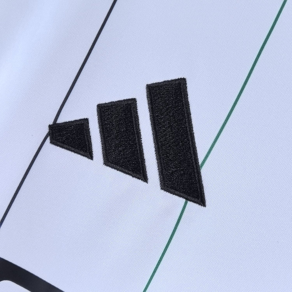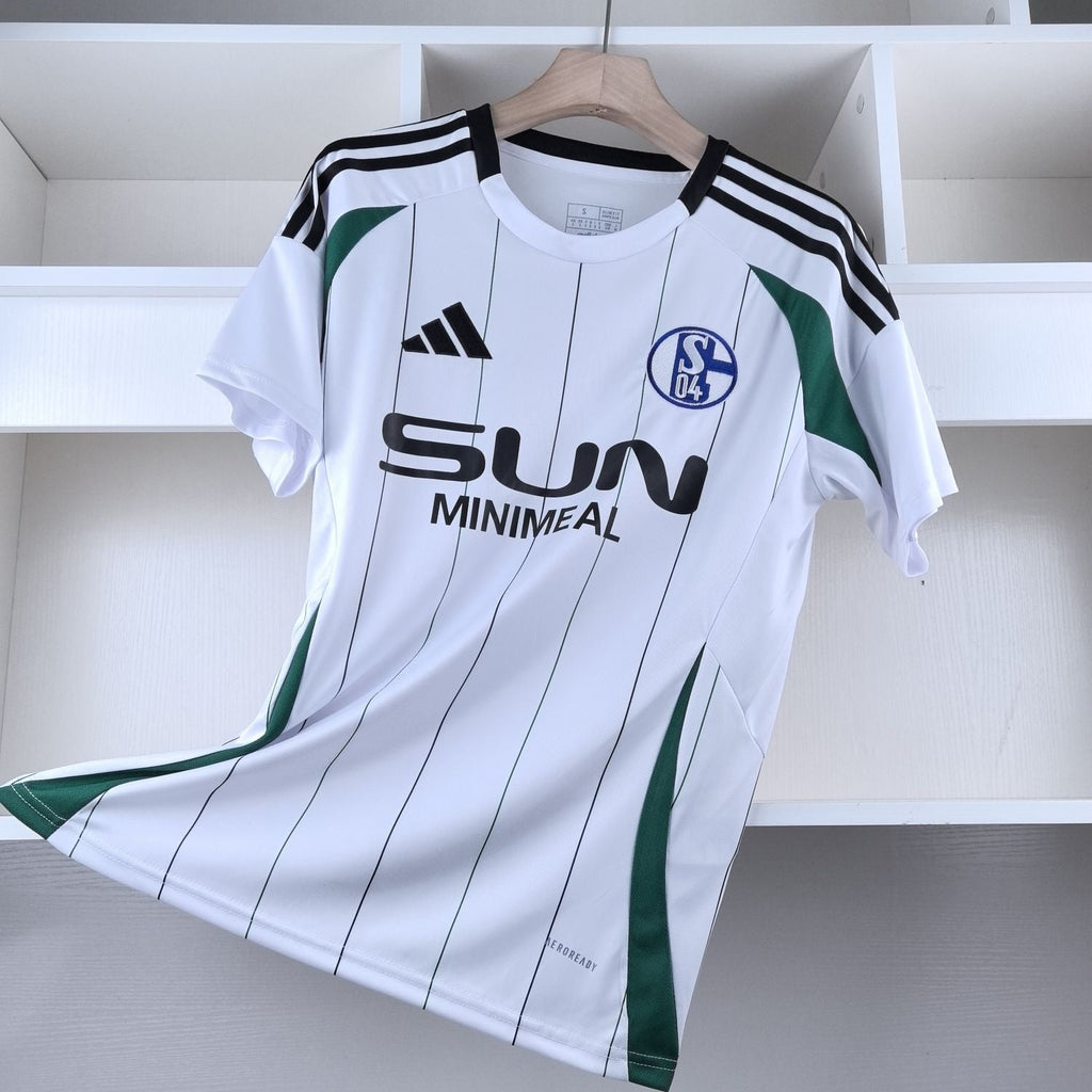 A Camisa 2 do Schalke 04 para a temporada 2024/2025, produzida pela Adidas, é o uniforme de visitante da equipa e destaca-se por seu design predominantemente branco. Ela conta com linhas verticais em preto na parte frontal e detalhes em verde nas laterais e axilas, que homenageiam a cidade de Gelsenkirchen. As três listras icônicas da Adidas aparecem em preto nas mangas, e o brasão da cidade está na nuca, reforçando o orgulho local.