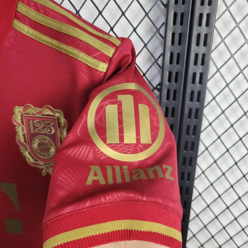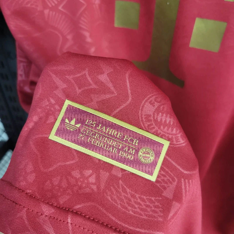Para celebrar os 125 anos do Bayern de Munique, a Adidas lançou uma camisa comemorativa especial. O manto apresenta a cor grená predominante, com detalhes dourados nas três listras nos ombros e faixas nos punhos, conferindo um estilo retrô que homenageia a rica história do clube.