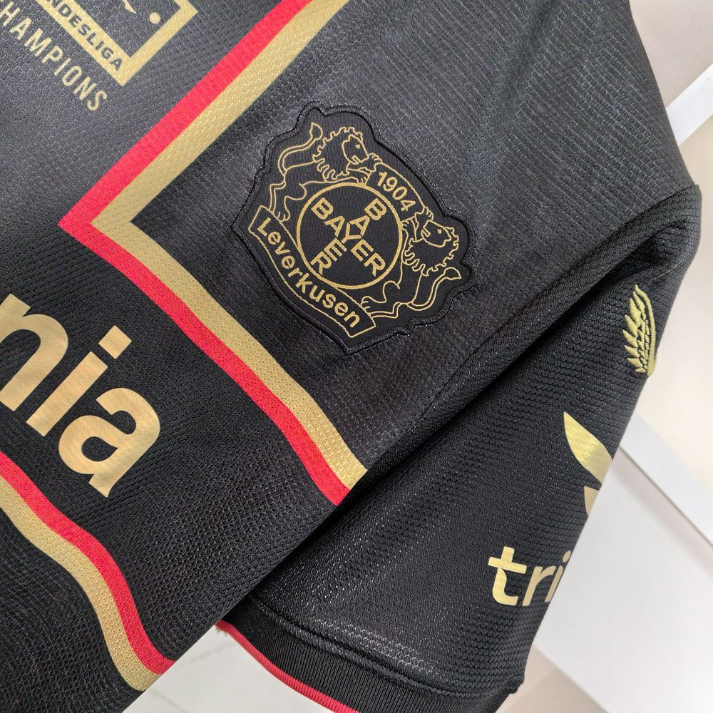 Celebre a conquista da Bundesliga 2023 com a camisa especial do Bayer Leverkusen! O manto negro, adornado com detalhes em dourado e vermelho, simboliza a força e a paixão da equipe. Um design moderno e elegante que marca um momento histórico para os torcedores.