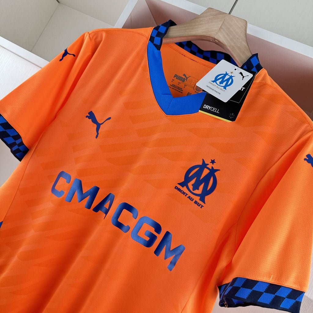 A nova camisa 3 do Olympique de Marseille para a temporada 2024/25 apresenta um design ousado e dinâmico, inspirado no universo das corridas automotivas e de motocicletas. O destaque fica por conta da cor laranja vibrante como base, complementada por um padrão quadriculado azul-marinho e preto nas bordas das mangas e na gola em V, remetendo às bandeiras utilizadas para sinalizar o fim das corridas, simbolizando velocidade e competitividade.