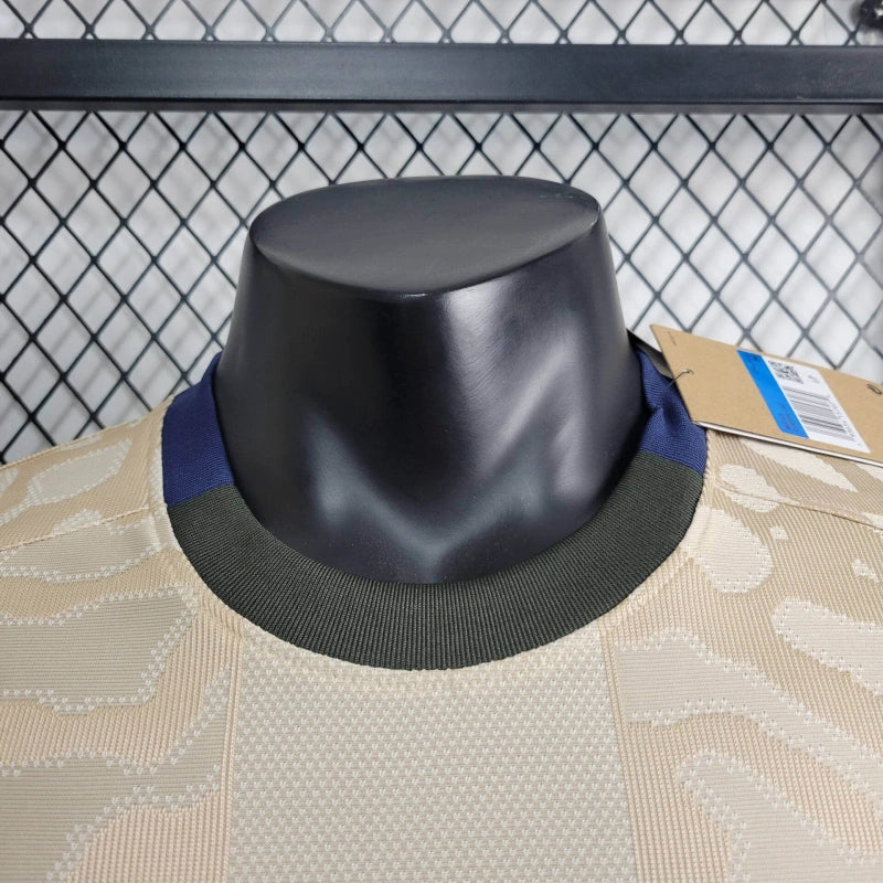 O modelo apresenta uma tonalidade creme (denominada "Hemp") como base, complementada por detalhes em verde escuro, azul marinho e preto. O escudo do PSG adota tons de verde escuro e dourado, enquanto as faixas pretas nas laterais e a gola dividida entre verde e azul escuro acrescentam detalhes distintos .