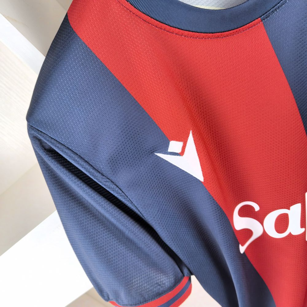 O 'Home 2024-25' apresenta as tradicionais quatro faixas verticais vermelhas e azuis, realçadas pela trama do tecido jacquard, com gola redonda e bordas das mangas em malha. A parte de trás da gola é personalizada com as cores do clube, onde as figuras 1925-2025 são impressas em dourado, com a taça Scudetto e o número 100 ao centro, celebrando o 100º aniversário do primeiro Scudetto conquistado pelo Bologna na temporada 1924-25. A parte de trás do pescoço é completada pelo logotipo da Macron e pela inscrição 'Designed in Bologna', certificando que cada peça é concebida, projetada e desenvolvida no Macron Campus em Valsamoggia, a poucos minutos da capital da Emília e do Centro Técnico 'Nicolò Galli' em Casteldebole. No peito, em silicone, à esquerda está o logotipo do Bologna FC 1909 e à direita o Macron Hero. Nas costas, a inscrição 'WE ARE ONE' reforça a identificação do clube. A camisa apresenta detalhes amarelos, cor usada nas últimas participações do Bologna na Coppa Uefa. Na parte inferior traseira, uma fita elástica interna repete as datas 1925-2025 em vermelho, intercaladas com a taça Scudetto.