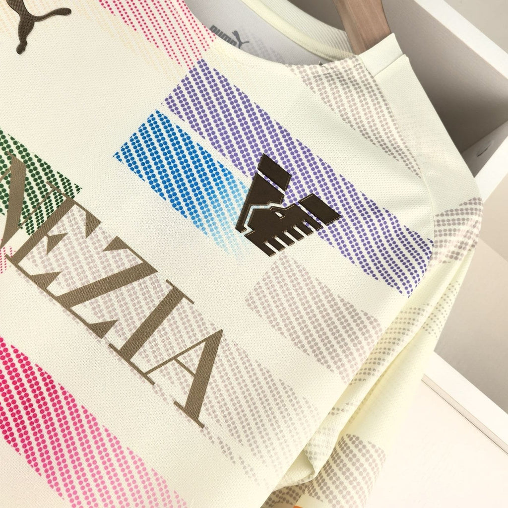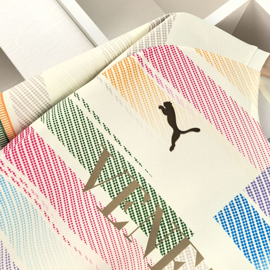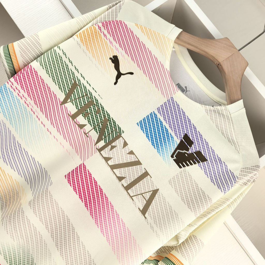 Inspirada no charme único de Veneza, a camisa edição especial Venezia 24/25 combina tradição e inovação, refletindo o espírito da cidade e do clube. Com design assinado pela Puma, esta peça apresenta um fundo creme elegante, adornado por padrões coloridos em linhas horizontais que remetem às luzes e reflexos vibrantes dos canais venezianos. O logótipo dourado do Venezia FC e o símbolo da Puma acrescentam um toque de sofisticação, enquanto os detalhes nas mangas reforçam o compromisso com o estilo e a modernidade.