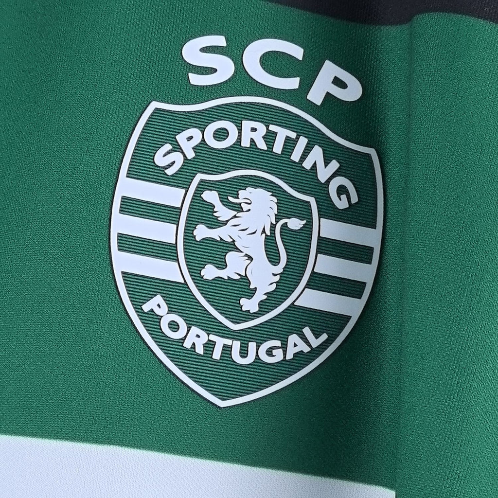 A camisa principal do Sporting Clube de Portugal para a época 2024/2025, assinada pela Nike, apresenta um design inovador que combina tradição e modernidade. O destaque vai para a predominância da cor preta, que aparece nas mangas, costas, parte superior do peito e gola, contrastando com as clássicas riscas verdes e brancas horizontais. Esta escolha de cores homenageia o centenário da última partida de Francisco Stromp com a camisola do clube, reforçando a ligação entre passado e futuro.
