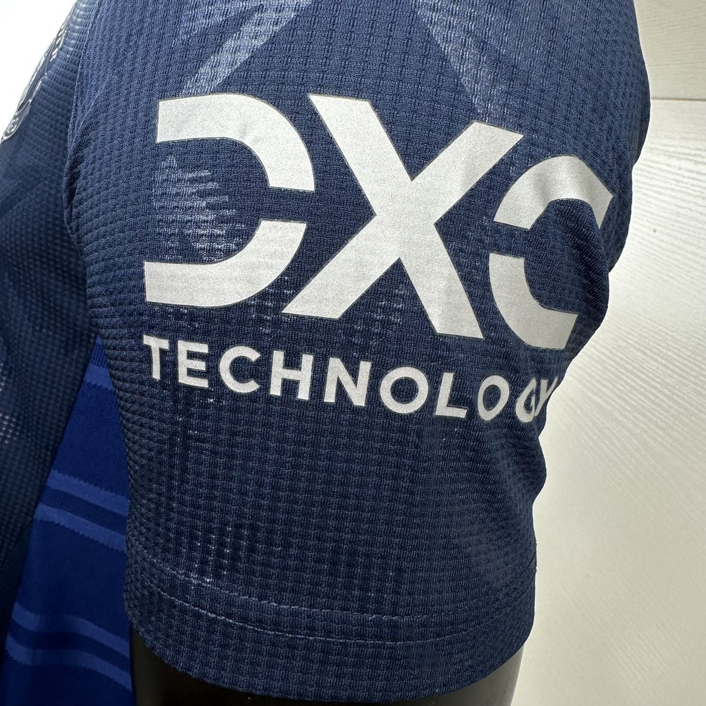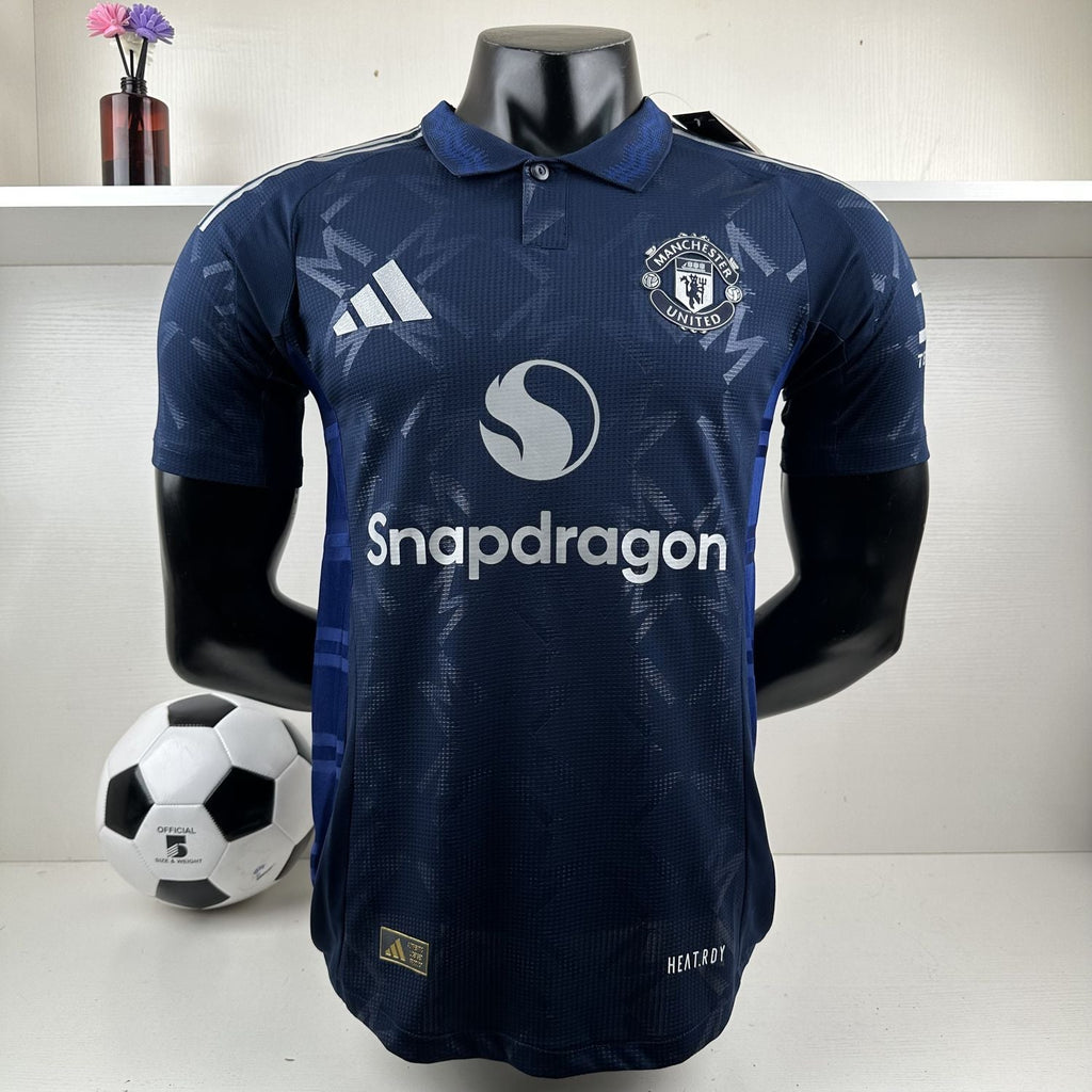 A camisa 2 do Manchester United 2024/2025 (versão jogador) destaca-se pelo seu design moderno e funcionalidade. Fabricada pela Adidas, a peça é predominantemente azul, com gola polo e detalhes refinados, incluindo o escudo do clube em material silkado. O modelo utiliza a tecnologia HEAT.RDY, que ajuda na regulação térmica, tornando-a ideal para máxima performance em campo.