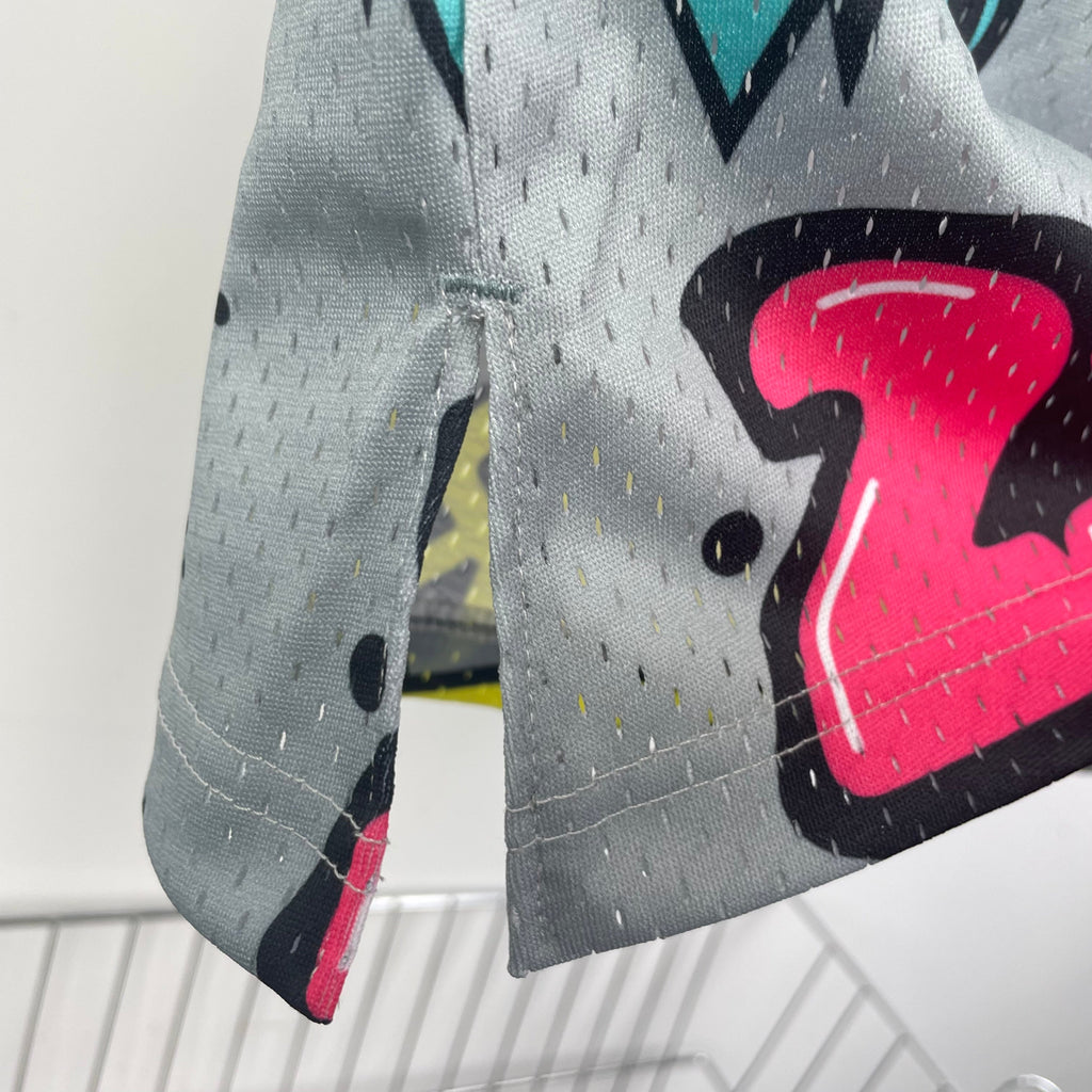 A "Slap Sticker" faz referência a um detalhe estético incorporado na jersey, inspirado nos adesivos que eram amplamente utilizados na cultura pop dos anos 90. Esses adesivos eram muitas vezes vistos em objetos de colecionador e itens de vestuário, adicionando um elemento de autenticidade e exclusividade. Na jersey da Mitchell & Ness, esse conceito é resgatado para dar um charme adicional ao design, reforçando a conexão com a época e o jogador homenageado.