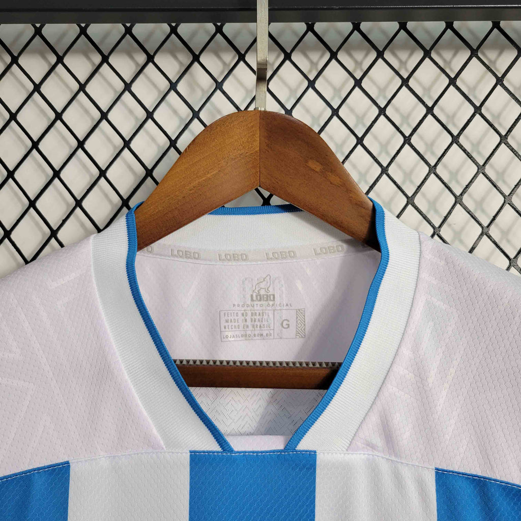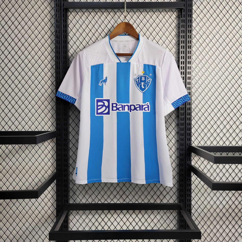 A Camisa 1 do Paysandu para a temporada 2023/2024 é predominantemente branca, com três listras verticais em azul celeste na parte frontal. A gola é branca, com detalhes em azul celeste, e as mangas seguem o padrão branco com detalhes em azul. O tecido é leve e respirável, proporcionando conforto tanto para a prática esportiva quanto para uso casual.