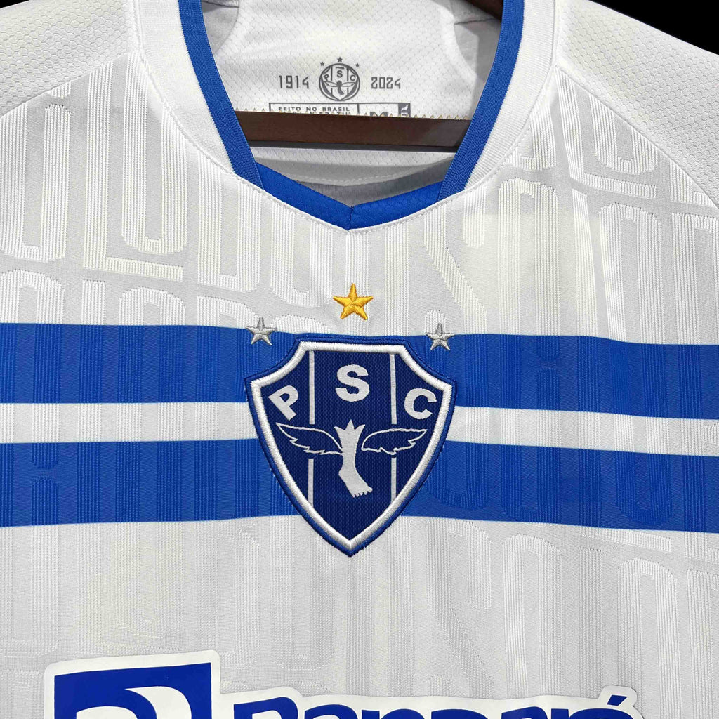 A camisa 2 do Paysandu Sport Club para a temporada 2024/2025 é uma verdadeira homenagem à tradição e à modernidade, unindo o legado do clube com elementos contemporâneos. O modelo apresenta um design predominantemente branco, com detalhes em azul celeste que remetem às cores icônicas do clube. Linhas geométricas sutis no tecido destacam um padrão inspirado nos traços culturais e naturais da região amazônica, reforçando o orgulho de ser um clube da Amazônia.