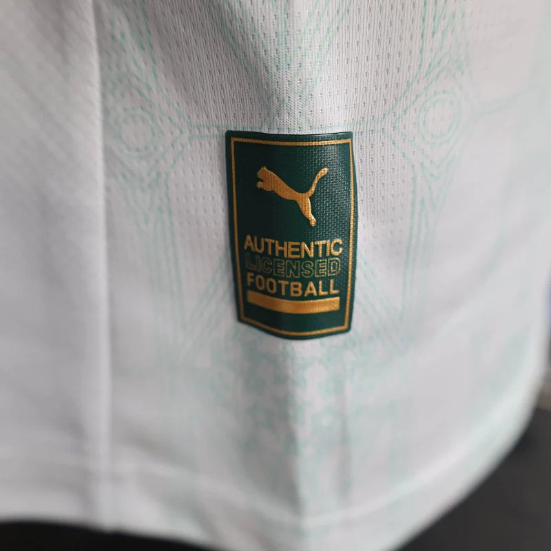 A Camisa II do Palmeiras para a temporada 2025/2026, versão Jogador, desenvolvida pela Puma que combina tradição e inovação. Predominantemente branca com mangas verdes, o uniforme apresenta uma gola polo branca que adiciona um toque clássico ao design. O escudo oficial do Palmeiras é emborrachado e texturizado no lado esquerdo do peito, enquanto o logo da Puma aparece destacado no lado direito. O design incorpora grafismos que remetem às taças conquistadas pelo clube, simbolizando as glórias e a história vitoriosa do Verdão.