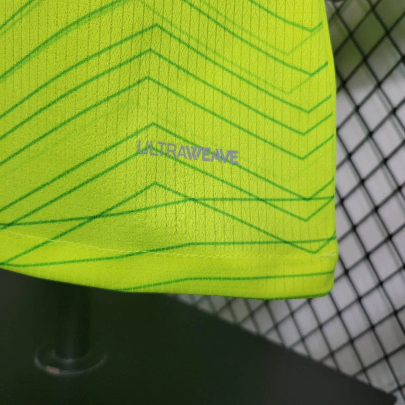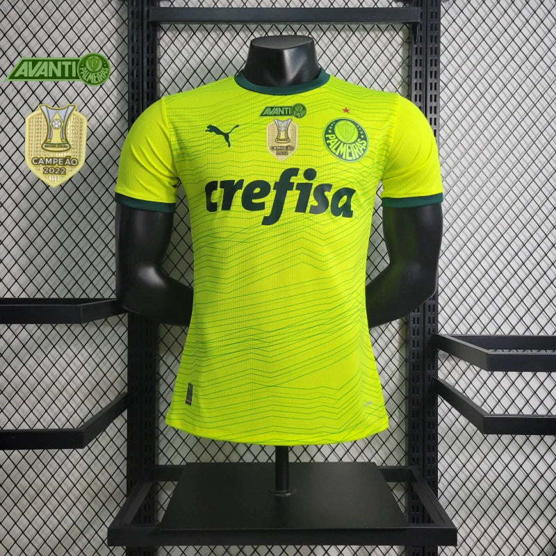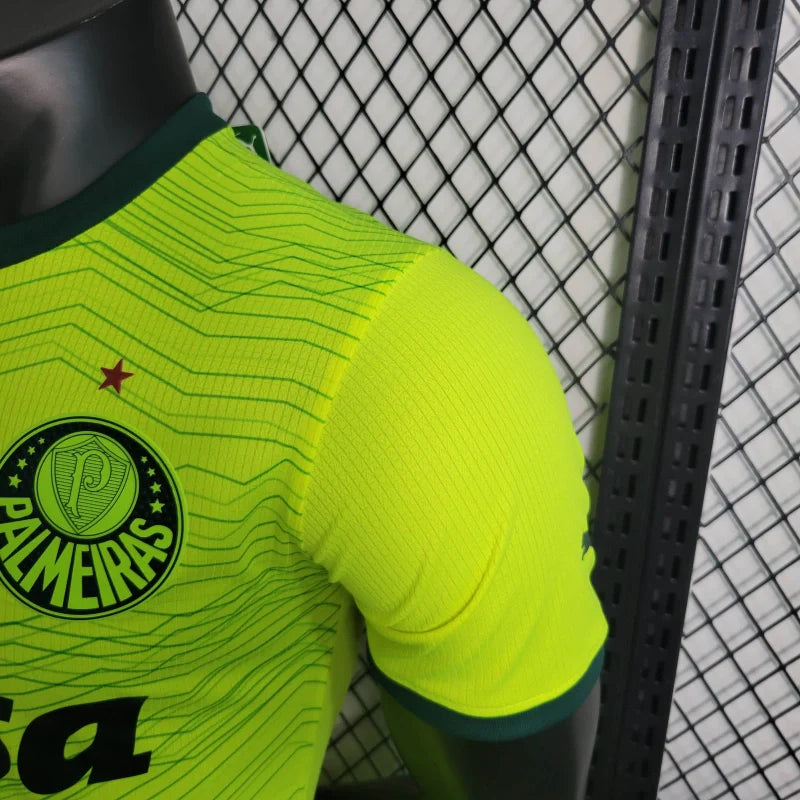 A Camisa 3 do Palmeiras 2023, modelo jogador, destaca-se pelo seu design em verde-limão com detalhes em verde escuro, homenageando a "Terceira Academia" do clube. Este uniforme é confeccionado com a tecnologia dryCELL da Puma, que proporciona alta absorção de umidade, mantendo o corpo seco e confortável durante as atividades.