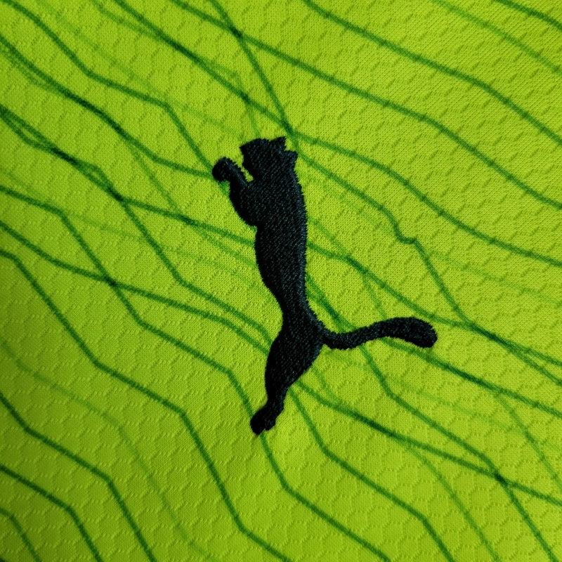 A Camisa 3 do Palmeiras 2023 Feminina é uma peça da Puma, fornecedora de material esportivo do clube. Este modelo destaca-se pela cor verde-limão com detalhes em verde escuro, oferecendo um design moderno e diferenciado para as torcedoras. O escudo da Sociedade Esportiva Palmeiras está bordado no lado esquerdo do peito, enquanto o logotipo da Puma aparece no lado direito. A gola é careca e canelada, proporcionando conforto e estilo.