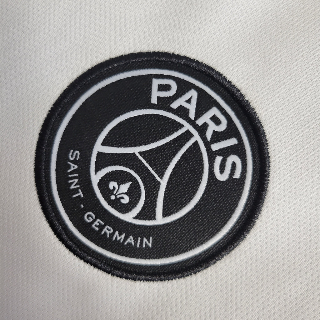 Design e Estilo: Predominantemente preta, a camisa apresenta uma faixa vertical central em branco pontilhado, conferindo um visual moderno e elegante. O escudo do PSG e o logotipo da Jordan aparecem em branco, harmonizando com o restante do design. Na parte de trás da gola, a palavra "PARIS" é estilizada com o logotipo Jumpman substituindo a letra "A", simbolizando a fusão entre o clube francês e a icônica marca de basquete.