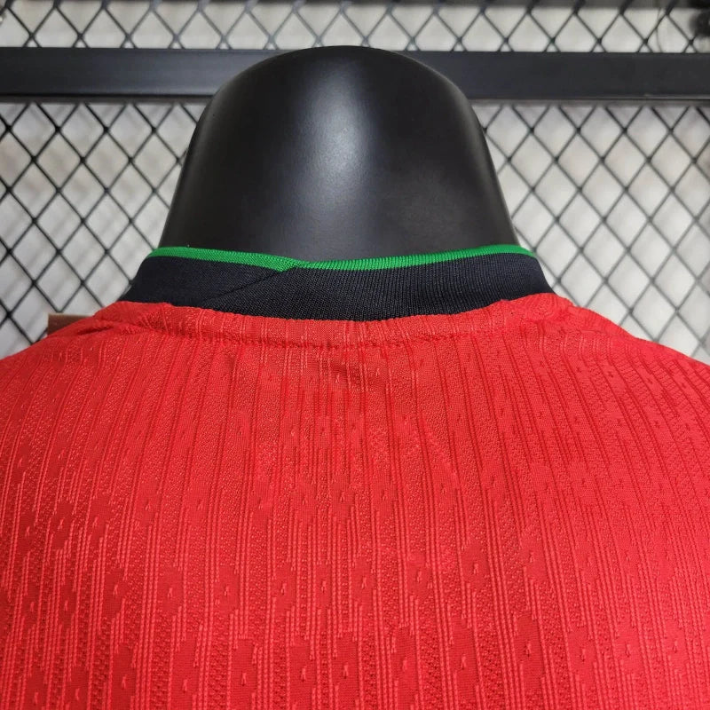 A camisa principal Portugal 2024/25 presta homenagem a uma herança nacional que criou um dos looks em campo mais reconhecidos do futebol. Com cores vibrantes retiradas diretamente da bandeira portuguesa, este equipamento é mais um de uma longa linha de camisolas principais em vermelho e verde para a seleção nacional. Os detalhes ocultos homenageiam a ligação e a união do atual plantel, à medida que se prepara para entrar no palco europeu.