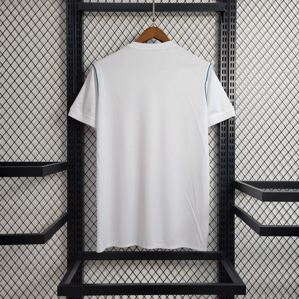 A camisa 1 do Real Madrid 2017/18 é um clássico em branco com detalhes em azul turquesa, representando elegância e tradição. Com gola em "V", tecnologia Climacool e o icónico escudo bordado, foi usada na histórica conquista da 13ª Liga dos Campeões.