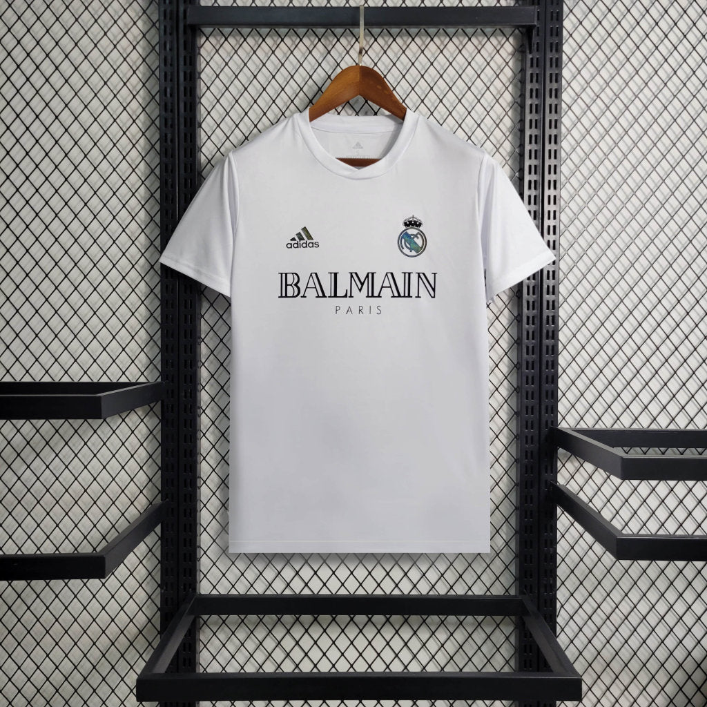 A camisa especial Real Madrid x Balmain Paris 2023 é uma peça única que celebra o encontro entre o mundo do desporto e da alta moda. Desenvolvida pela icónica casa de moda francesa Balmain em colaboração com o gigante espanhol Real Madrid, esta edição limitada combina estilo sofisticado com a tradição de um dos clubes mais prestigiados do mundo.