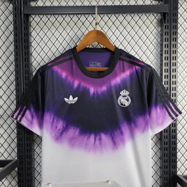 A Adidas lançou uma coleção especial para o Real Madrid em comemoração ao Ano Novo Chinês de 2025. O destaque é a camisa pré-jogo masculina, que apresenta um design tie-dye nas cores roxa e branca, simbolizando transição e renovação. O escudo do Real Madrid e o logotipo da Adidas estão presentes em branco no peito.